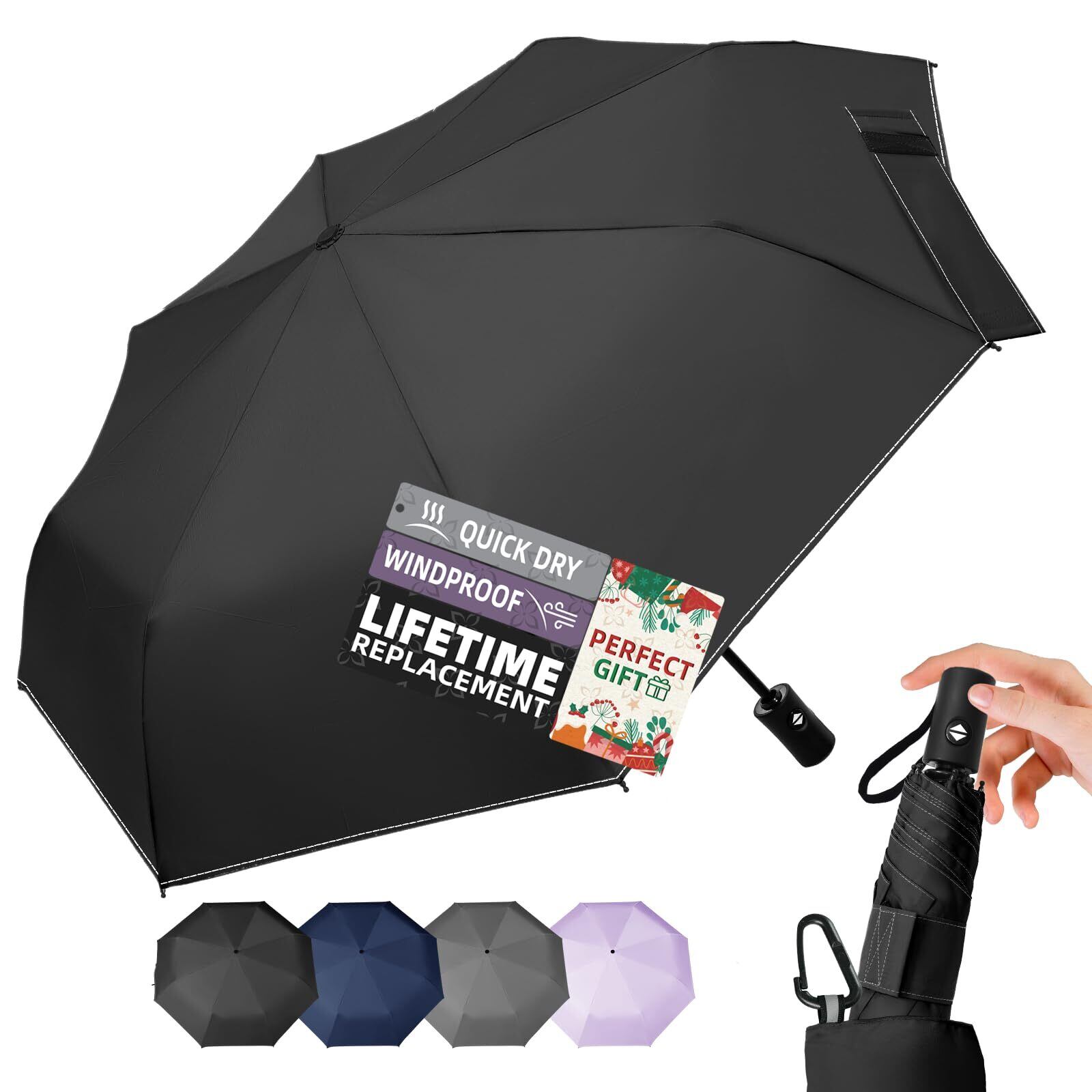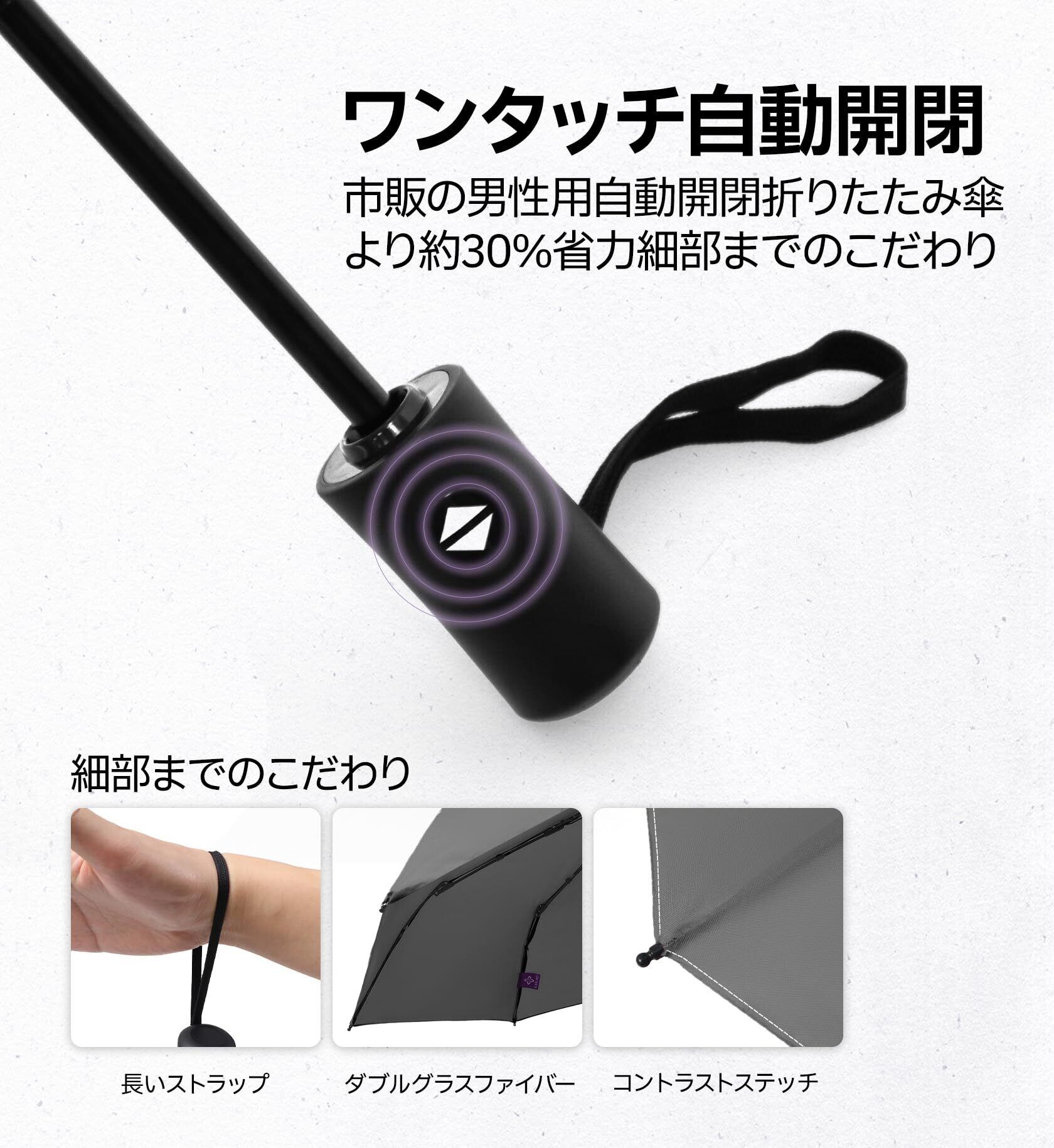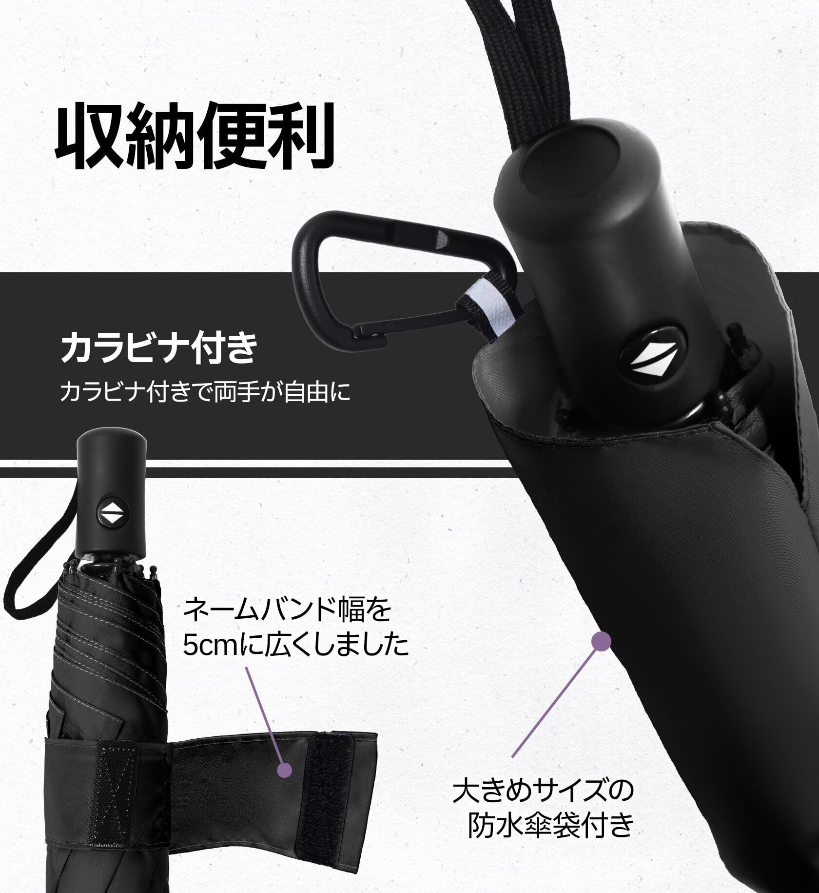 「デザイン」広げた傘袋と5cmネームバンドで収納が簡単、ハンドルの握り心地が良い、おしゃれなコントラストステッチ、カラビナで携帯性も向上した自動開閉折りたたみ傘は、色々なな細かい部分までより優れた使用体験を実現します