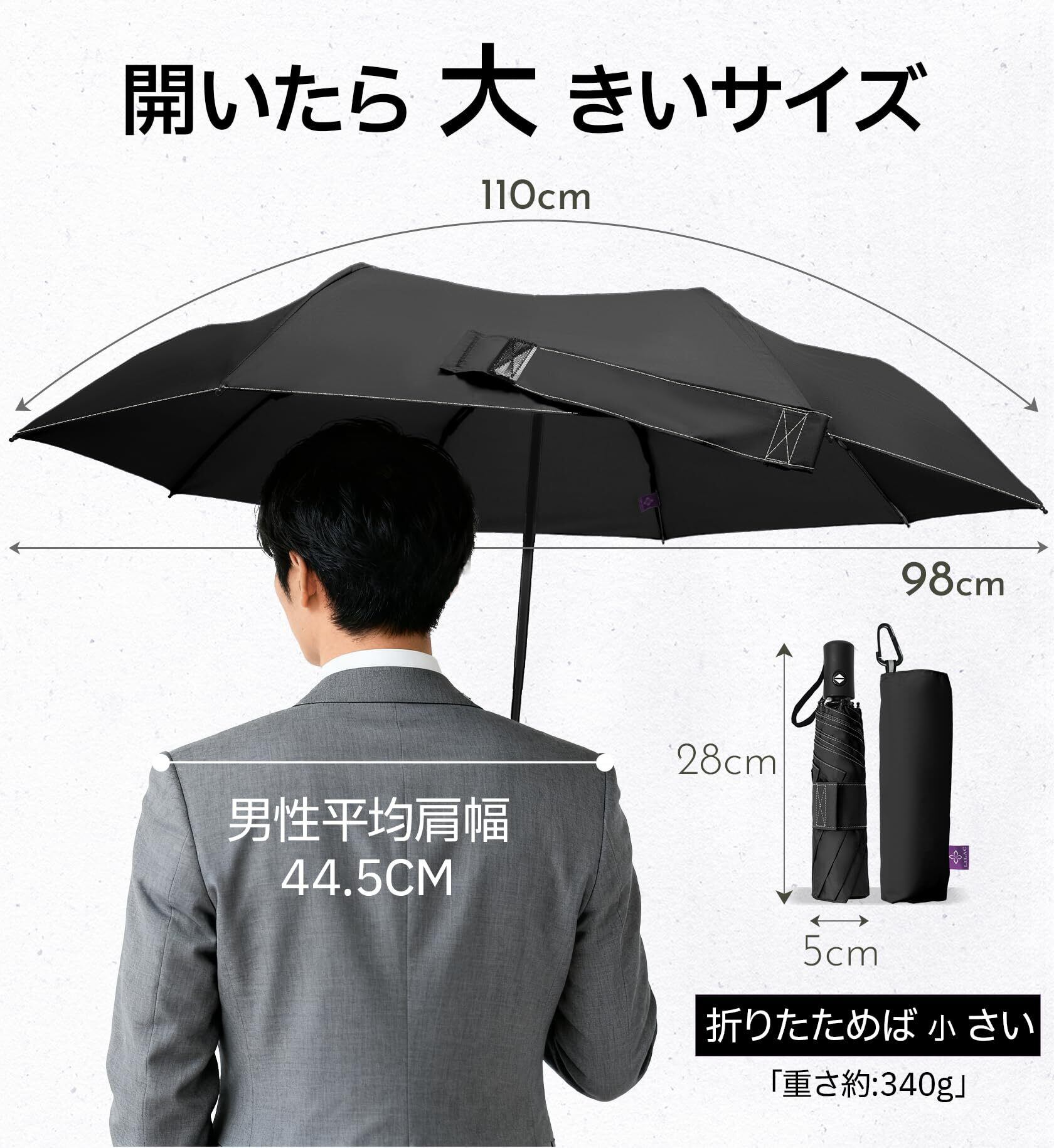 「傘の直径は約100cmで、体全体をしっかり守ることができます。荷物やスーツも濡れにくく、通勤時やお出かけ時に心強いパートナーです。さらに、2人で差しても窮屈さを感じさせないワイドサイズです!」
