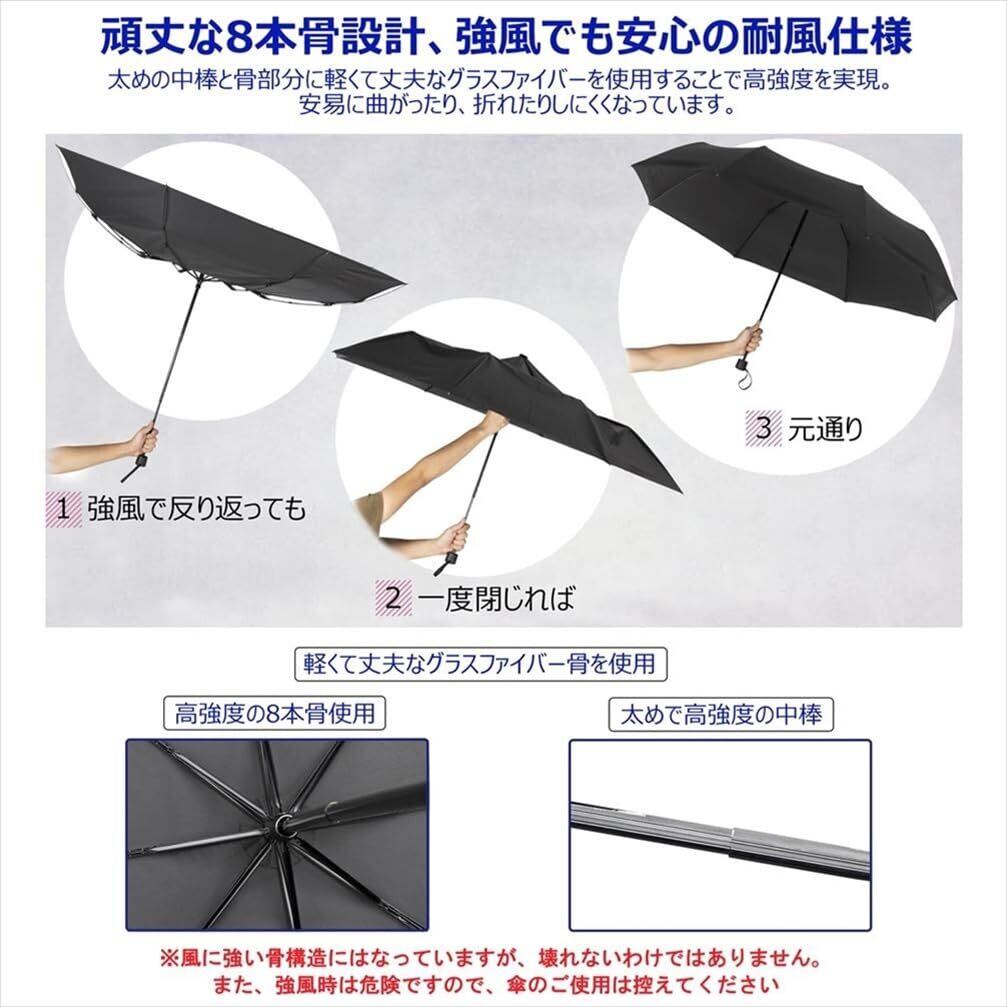 「8本骨を採用した頑丈なデザインにより、強風にも耐えられる造りが特長です。骨がしっかりしているので、風に煽られても安心して使用できます。耐久性も高く、長くお使いいただける一品です。」