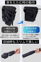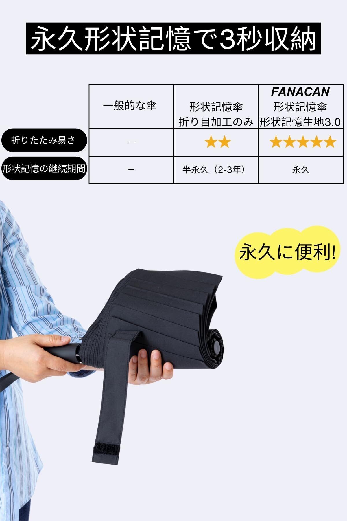 【永久形状記憶折りたたみ傘】これまでの折りたたみ傘にありがちな煩わしさを解消します。一般的な傘は、折りたたむのが面倒で、どうしてもぐちゃぐちゃになったり、スムーズにたためずにストレスを感じたことはありませんか?FANACAN傘は、独自の形状記憶生地3.0を採用しているため、折り目加工だけでは実現できない驚くほどの折りたたみやすさを実現。誰でも簡単に美しくたためるため、毎日の使用が格段に快適です。 さらに、一般的な形状記憶傘(折り目加工のみ)の効果が2〜3年で薄れてしまうのに対し、FANACAN傘の形状記憶効果は永久的に持続します。つまり、一度購入すれば、買い替えの手間もなく、長期間その便利さを体感していただけます。 雨が降るたびに傘を使うのが面倒、たたむのが苦手…そんな悩みをFANACAN傘で解消しましょう。これ一つで、毎日の傘ライフがもっと快適になります!