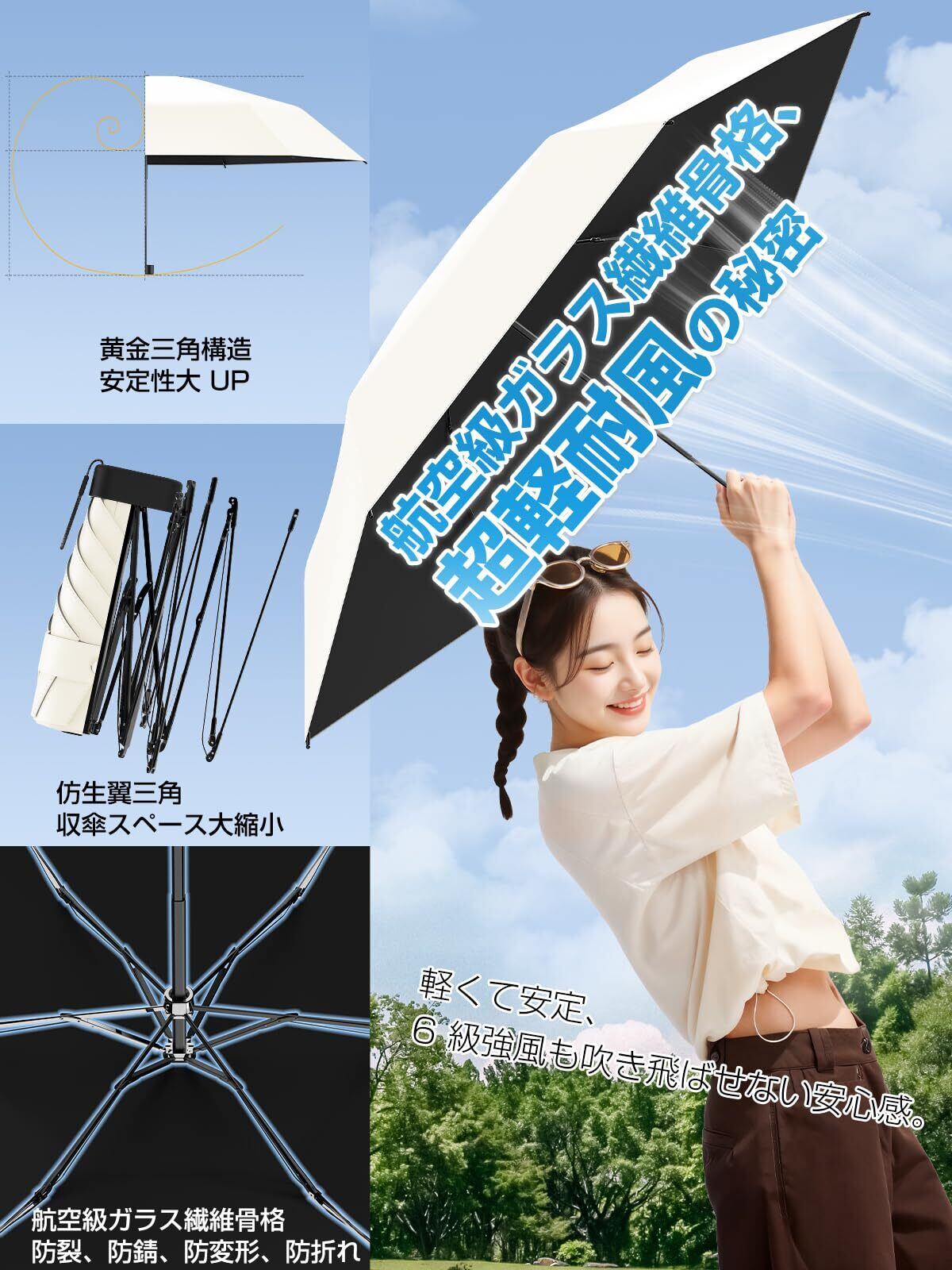 【100% 紫外線防止 & 100% 遮光・遮熱日傘】 特殊なコーティング技術と素材を使用し、100% の紫外線遮断性能を実現しています。有害な紫外線を完全に遮り、肌を日焼けや老化から守り、健康な肌を維持するために役立ちます。100% の遮光・遮熱機能も備えています。日差しの強い日にも傘を開けるだけで涼しさを感じられ、太陽の光と熱を効果的に遮断して、快適な空間を作り出します。