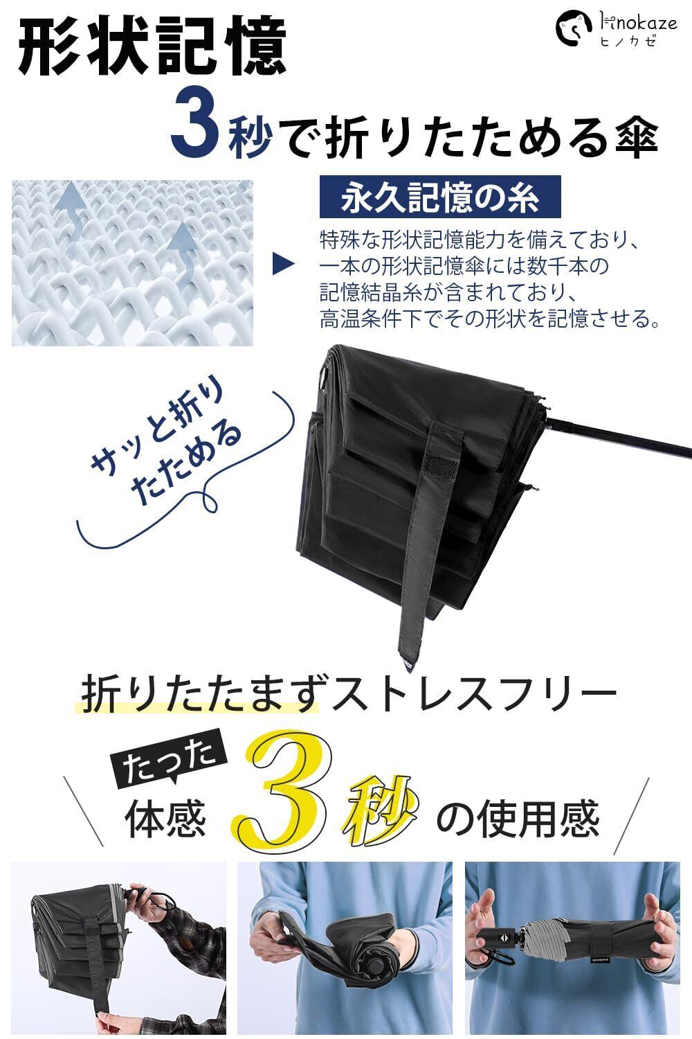 【形状記憶加工傘】折りたたみ傘 形状安定加工を施したこの傘は、わずか3秒でスムーズにたたむことが可能で、忙しい朝や急な雨の日でもストレスなく収納できます。また、収納時にかさばらず美しくまとまるため、カバンの中でも場所を取らずスマートな印象をキープ。一般的な形状安定傘はシートを貼り付けることで重さや剥がれといった問題がありましたが、HINOKAZEの形状安定傘は特殊な熱加工技術で「生地そのもの」に折り目を付けるため、軽さはそのままに半永久的な効果を実現しました。これにより、畳む動作が簡単になり、これまで折りたたみ傘に苦手意識を持っていた方でも気軽にお使いいただけます。