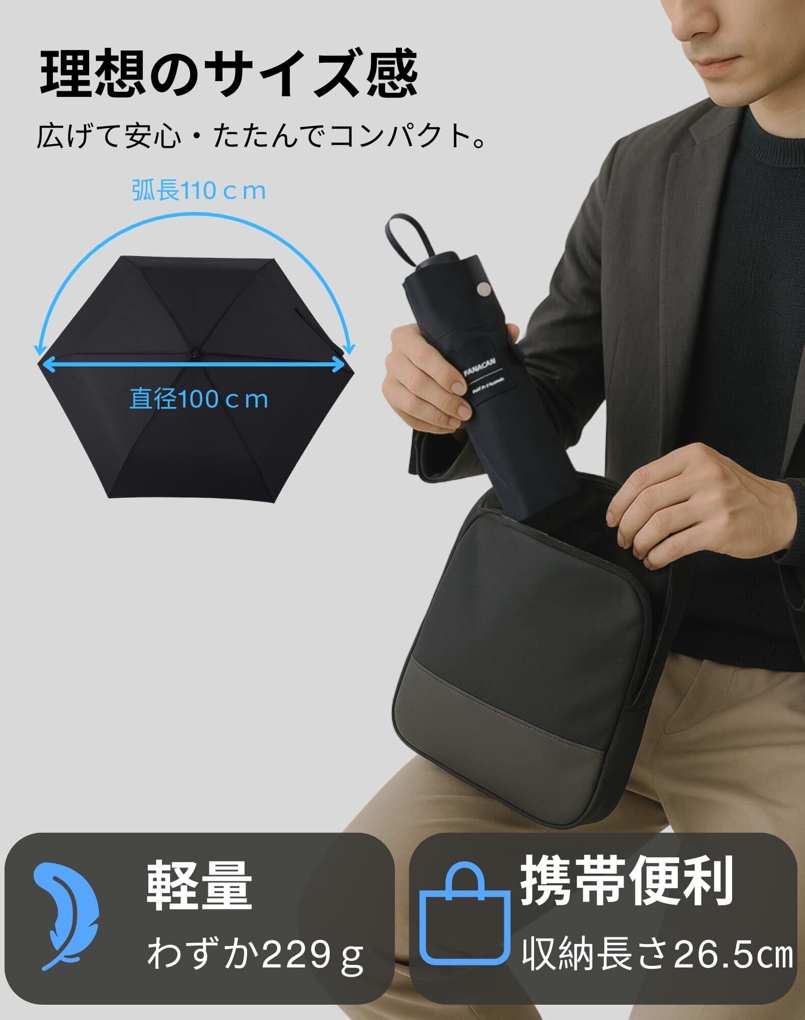 【軽量ながら大きいサイズ】重さわずか約229gの超軽量設計でありながら、広げると直径約100cm、弧長約110cmの大きなサイズを実現したこの折りたたみ傘は、体の大きな男性でも窮屈さを感じず、スーツやリュックまでしっかりカバーできる安心の使い心地。突然の雨でも濡れにくく、ビジネスシーンや外出時にも頼れる一本です。折りたたむと全長はたった約26.5cmと非常にコンパクトで、通勤用バッグやリュックにもすっきり収納可能。傘カバー付きなので、カバンや車に常備しておけば、急な雨にもスマートに対応できます。軽くて、大きくて、持ち運びやすい——すべての条件を満たすこの傘が、あなたの毎日に安心と快適をプラスします。
