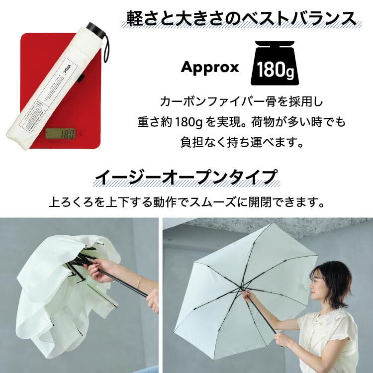 傘骨にカーボンファイバー素材を使用することで、直径105cmという大きさと耐久性を保ちながらも驚きの軽さ180gを実現。