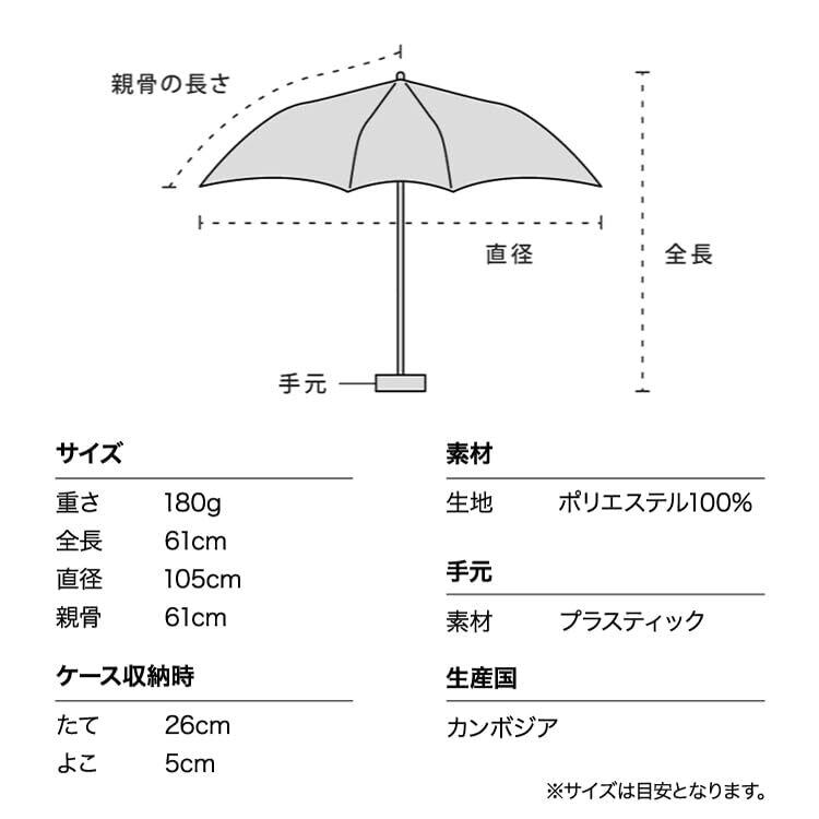 【直径105cm/重さ180g】軽さと大きさのベストバランスを叶える折り畳み傘… 傘骨にカーボンファイバー素材を使用することで、直径105cmという大きさと耐久性を保ちながらも驚きの軽さ180gを実現。 身体も荷物もしっかり守りながら、持ち運びやすい晴雨兼用傘は1年を通じて大活躍です。 シンプルデザインの優しいカラーは、性別年代を問わず、様々なシーンで幅広くお使いいただけます。