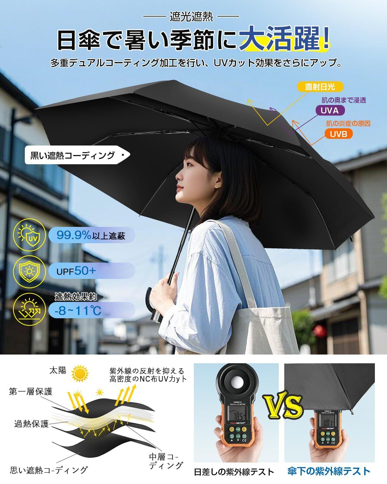 【UVカット&超撥水 晴雨兼用傘】この日傘 uvカット 100 遮光 折り畳みの内側には遮光遮熱コーティングを施され、遮光率100%、UVカット率99.9%に加えて、黒い裏生地が眩しさを軽減し、地面から反射する太陽熱を遮り、強い日差しの季節にも日傘として快適にご利用いただけます。さらに、本日傘 折りたたみは雨が染み込みにくい高密度生地を使用し、表面にはテフロン(Teflon)撥水コーティングが施されています。ひと振り、もしくは数回振るだけで雨粒をほとんど落とせます。満員電車に乗る時に傘の水滴で衣服が濡れないよう周囲への配慮もバッチリ。日差しも、雨も、強風も365日二れ1本!