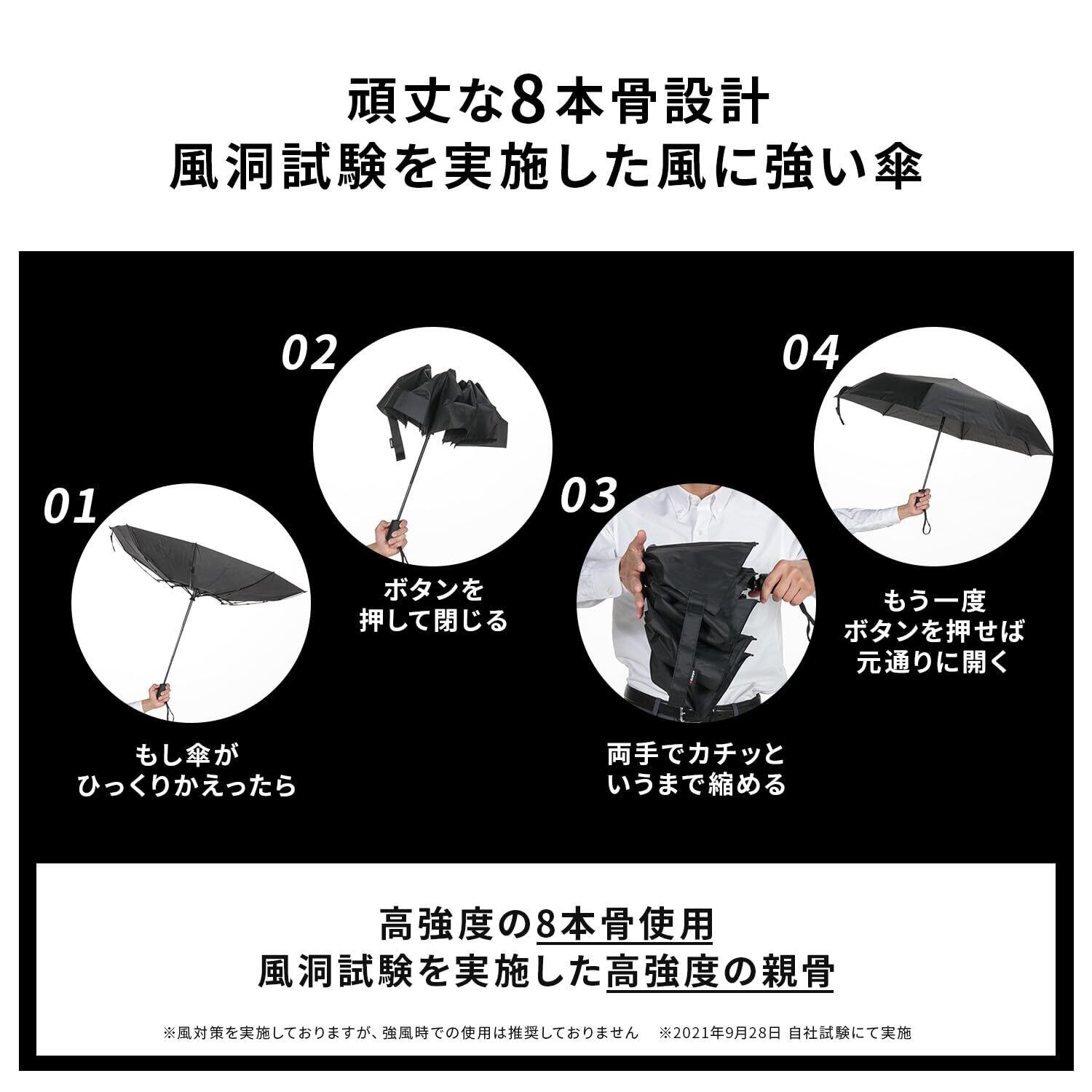 【風洞試験済みの風に強い傘】風洞試験を行い、風に対して対策を重ねた折り畳み傘です。風に対して研究しつくした傘の形状となっております。※強風時の使用は推奨しておりません。