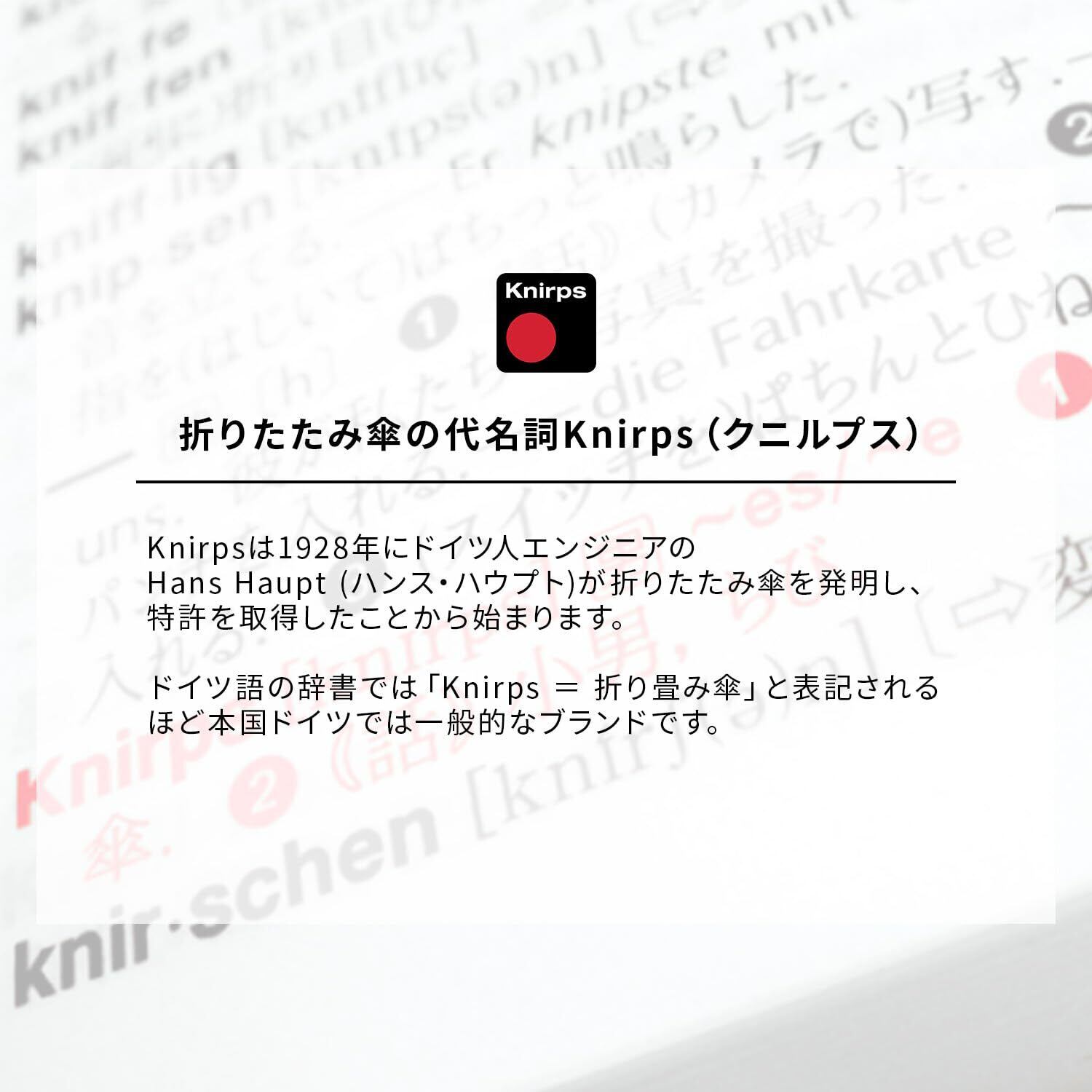 【Knirps(クニルプス)について】Knirpsは1928年にドイツ人エンジニアの Hans Haupt (ハンス・ハウプト)が折りたたみ傘を発明しを取得したことから始まります。長い歴史から醸し出されるクラシックな傘をお楽しみいただけます。