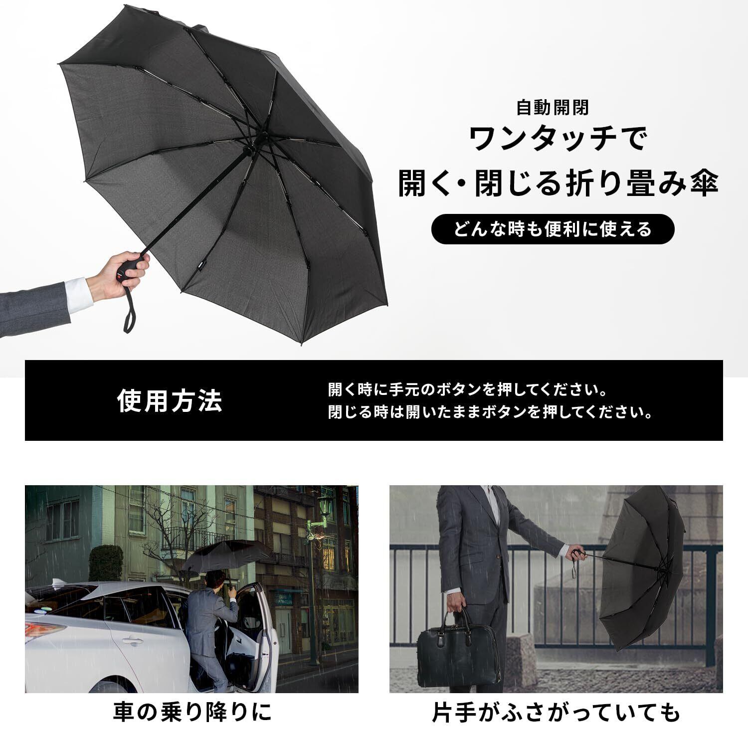 「この折畳み傘は、ボタン一つで瞬時に開くことができ、急な雨でも慌てずに対応できます。両手が塞がっている時でも片手で簡単に使えるため、通勤や外出時に大変便利です。」