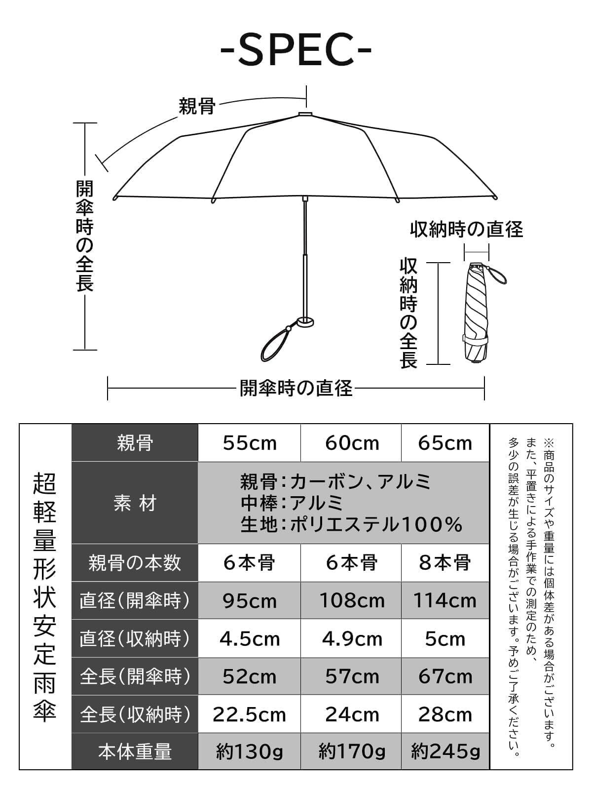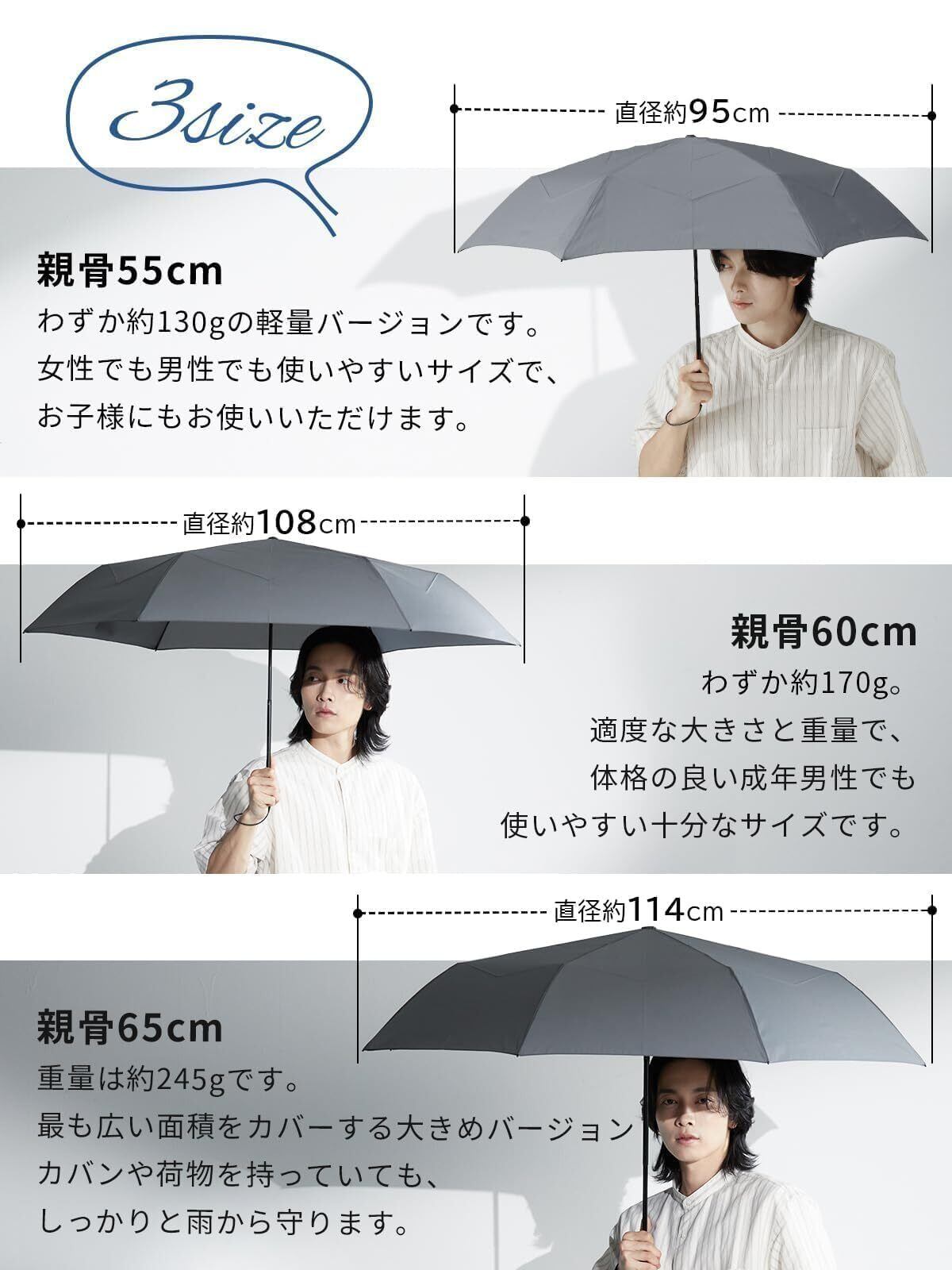 【選べる3サイズ・幅広く使える】家族で使える3サイズ展開。性別を問わず、子どもから大人までぴったりだから、傘選びの手間もこれ一本で解決します。<親骨55cm・6本骨>重さは約130gで、直径は約95cmで、収納時の長さは22.5cmです。男女問わず、子どもにもぴったりのアイテムです。<親骨60cm・6本骨>重さは約170gで、直径は約108cmで、収納時の長さは24cmです。適度な大きさと重量で、体格の良い大人男性でも使いやすいです。<親骨65cm・8本骨>重さはわずか245gで、同じ大きさの傘の中で最も軽量です。直径は約114cmで、収納時の長さは28cmです。広い範囲を守るため、大雨時でも荷物をしっかりと濡れを防ぎます。(カラー・商品ごとに多少差異がございますこと予めご了承ください。)