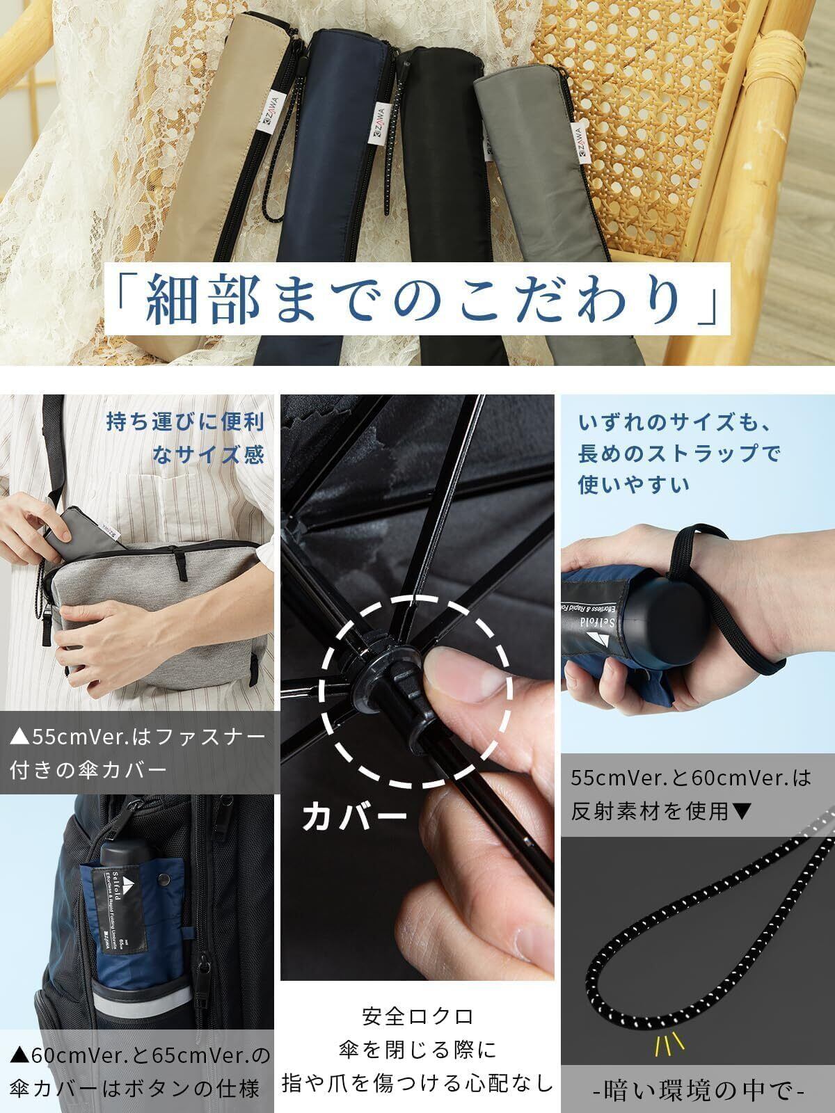 「130gから245gの範囲で、非常に軽量な設計です。親骨の長さは55cm、60cm、65cmの3サイズから選べるので、ご自身のスタイルや用途に合わせてお選びいただけます。通勤や旅行にぴったりのアイテムです。」