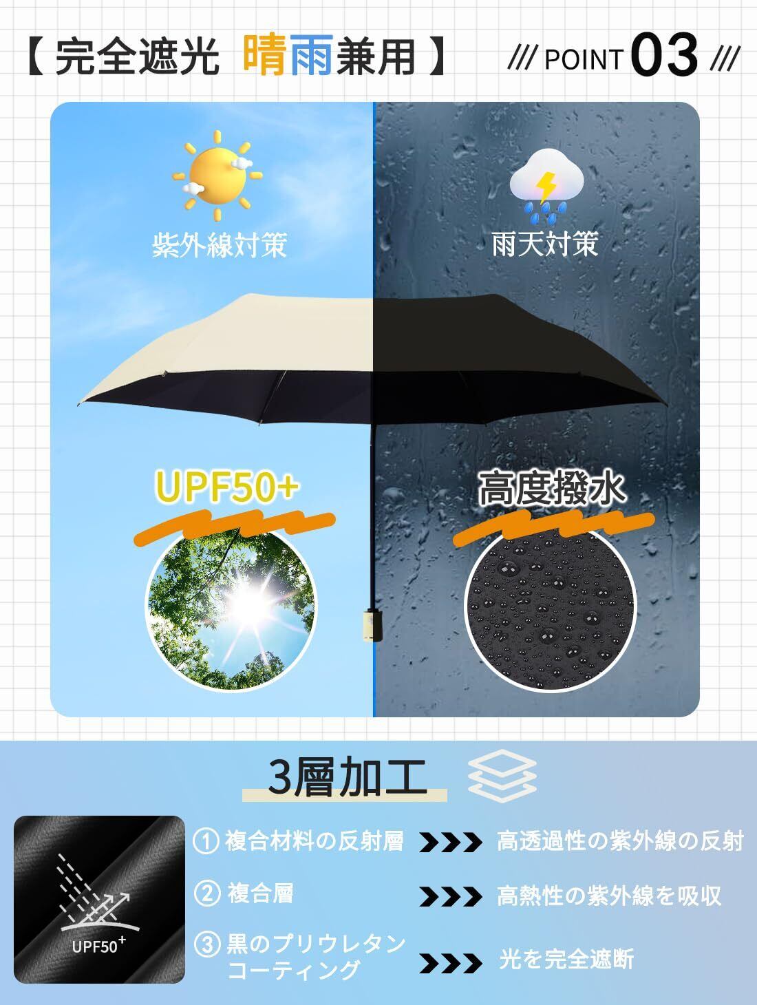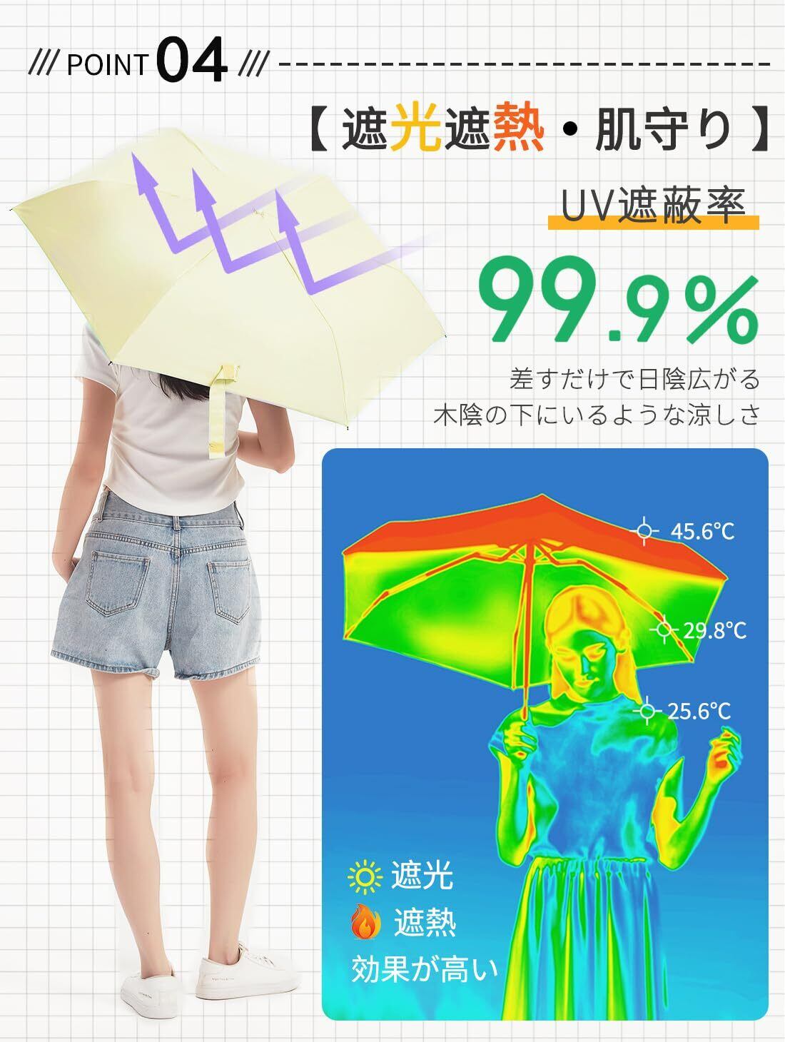 【紫外線対策・遮光遮熱】UPF50+の高い紫外線防止効果を誇り、99.9%の紫外線をシャットアウトします。高密度の傘布と日焼け止めの黒のポリウレタンコーティング加工を組み合わせた、日焼けを防ぐために必要なUVカットの性能を兼ね揃えた、紫外線対策にはピッタリのアイテムとなっています。これにより、真夏でも外出も涼しく快適に過ごせます。この折り畳み傘は夏の必需品で、日差しを気にせず、心地よい時間をお楽しみください!