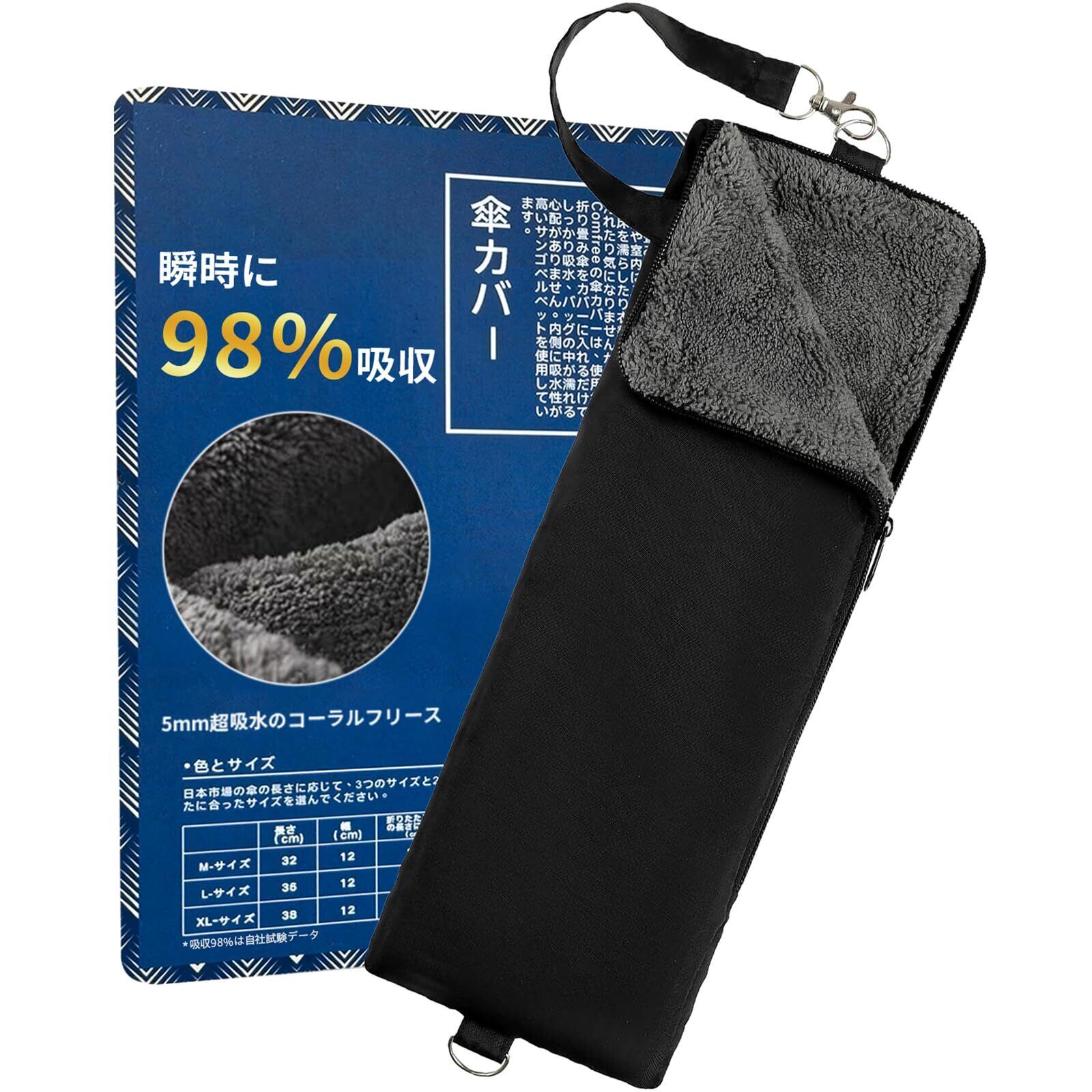 Comfree【瞬時に98%吸収】折りたたみ傘カバー 傘ケース 折りたたみ傘用 超 吸水 サンゴベルベット 軽量 梅雨 通勤 通学 (L(12cm*36cm), ブラック)