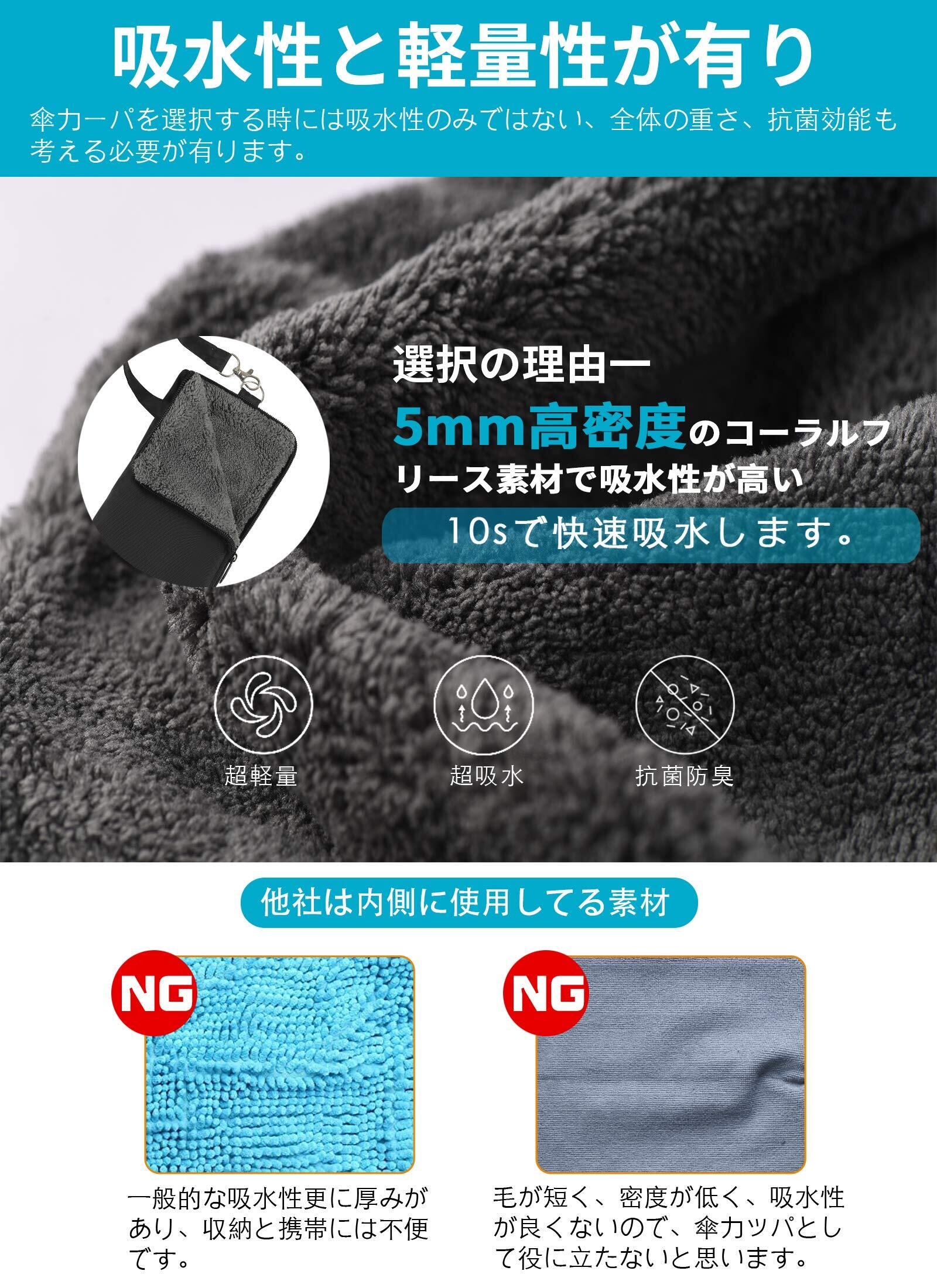 【超吸水素材】商品の内側は5mm高密度のコラールフリース素材を使って、超吸水且つ軽く薄いです。内側の雨粒は快速に吸水されます。