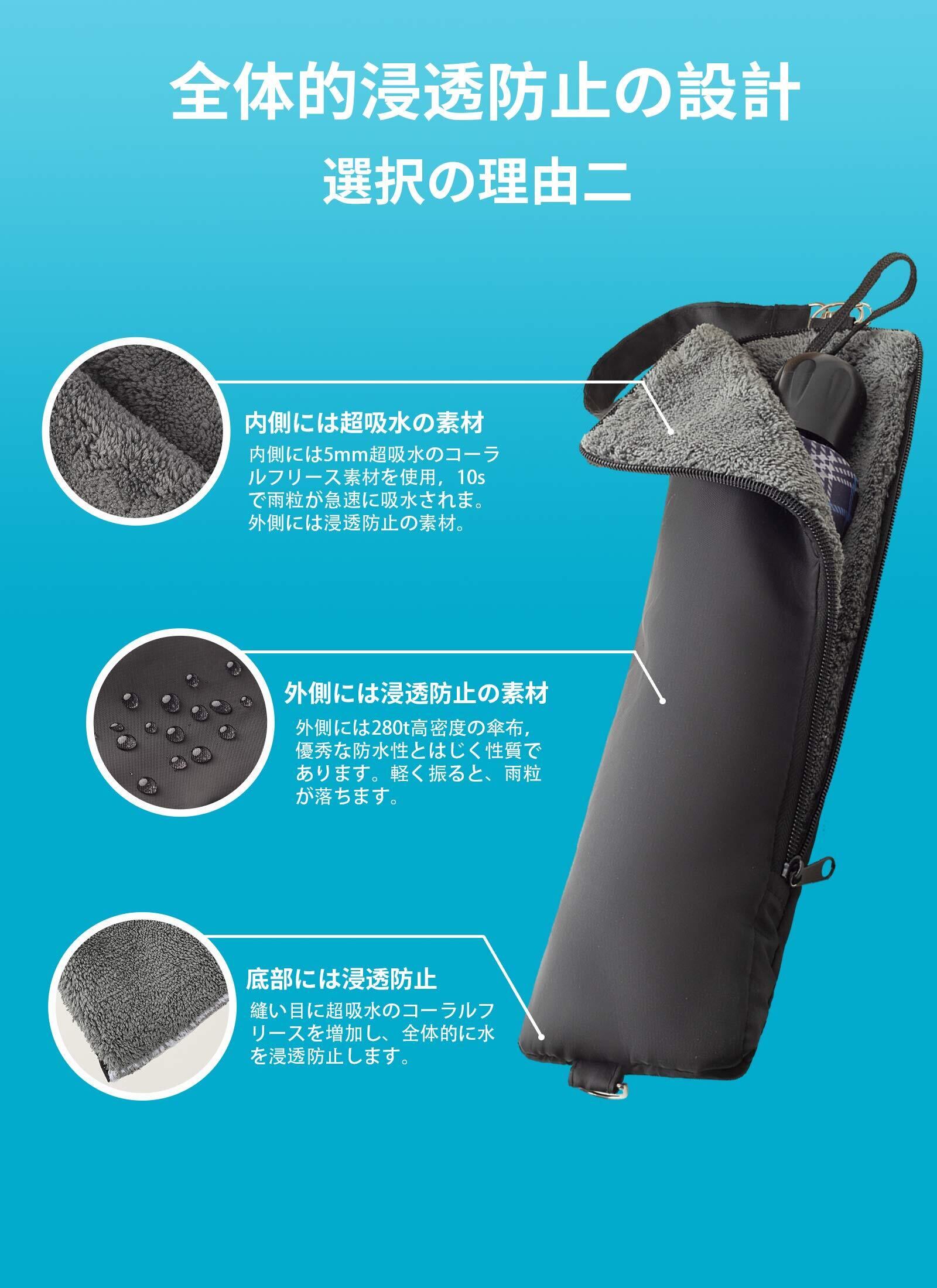 「瞬時に98%の吸収力を誇るこのカバーは、傘を使用した後の水滴をすぐに取り込むため、周囲を濡らさずに済みます。特に通勤や通学時に、大切なバッグや周囲の物を守ることができ安心です!」