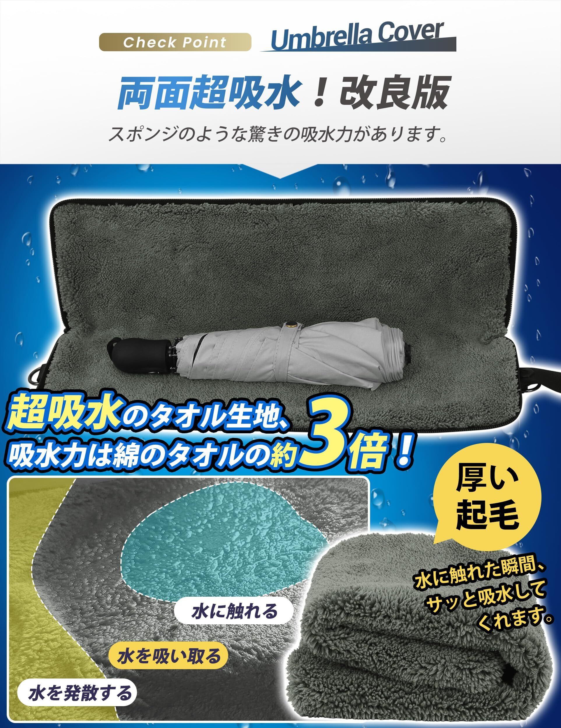「この傘カバーは、従来のカバーに比べて吸水力が3倍!雨の日も安心して使用できるため、傘を持ち歩くのが楽になります。濡れた傘を持たずに、快適に外出を楽しむことができます。」