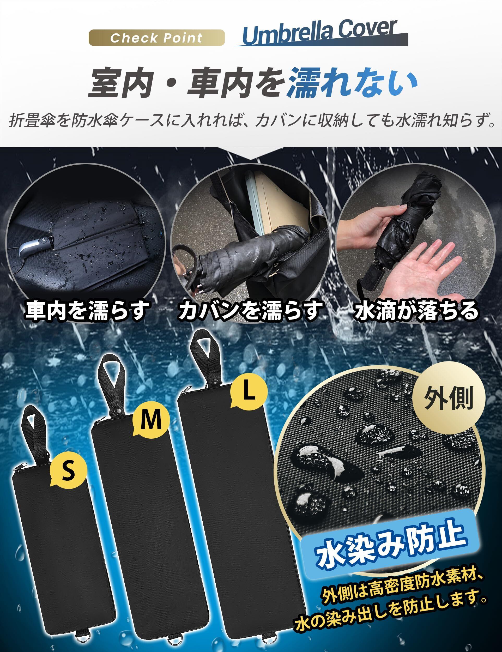 「3サイズから選べるため、フォルムや好みに合わせて選びやすいのが魅力。折りたたみ傘にも、長傘にもフィットするサイズ感で、どんなシーンにも対応します。これで、雨の日のパートナーがより快適になります。」