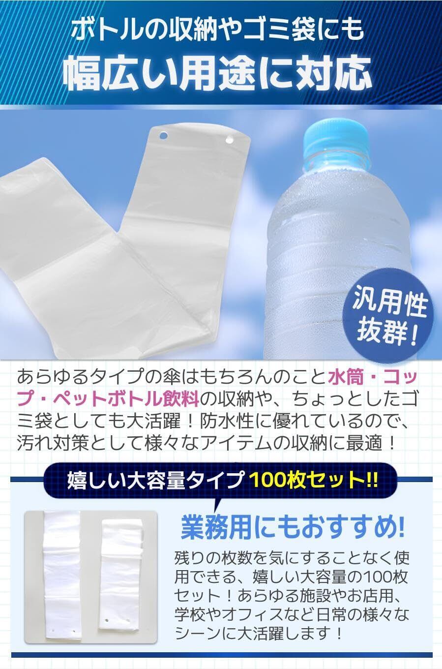 「お得な100枚セットなので、頻繁に使う方や家族での利用にも最適です。必要な時にすぐに取り出せるので、突然の雨に備える心強いパートナーになるでしょう。」