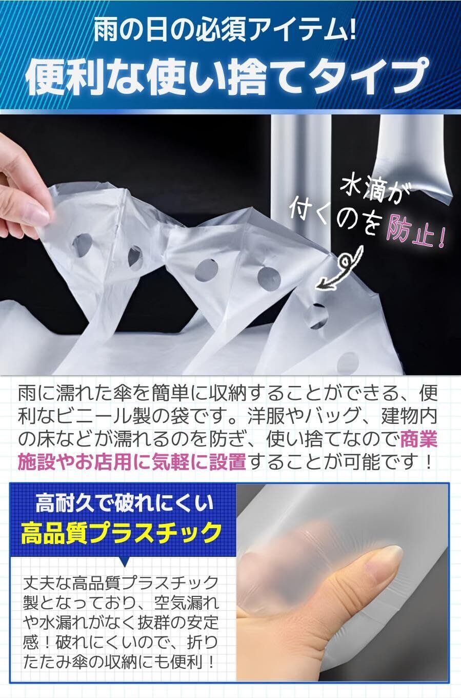 「この傘袋は、頑丈なビニール素材を使用しているため、破れにくく、使い捨てとしても安心です。特に雨の日の外出時に、濡れた傘からの水漏れをしっかりと防ぎ、バッグや車内を濡らすことがありません!」