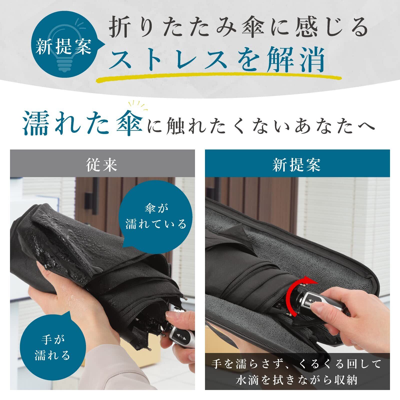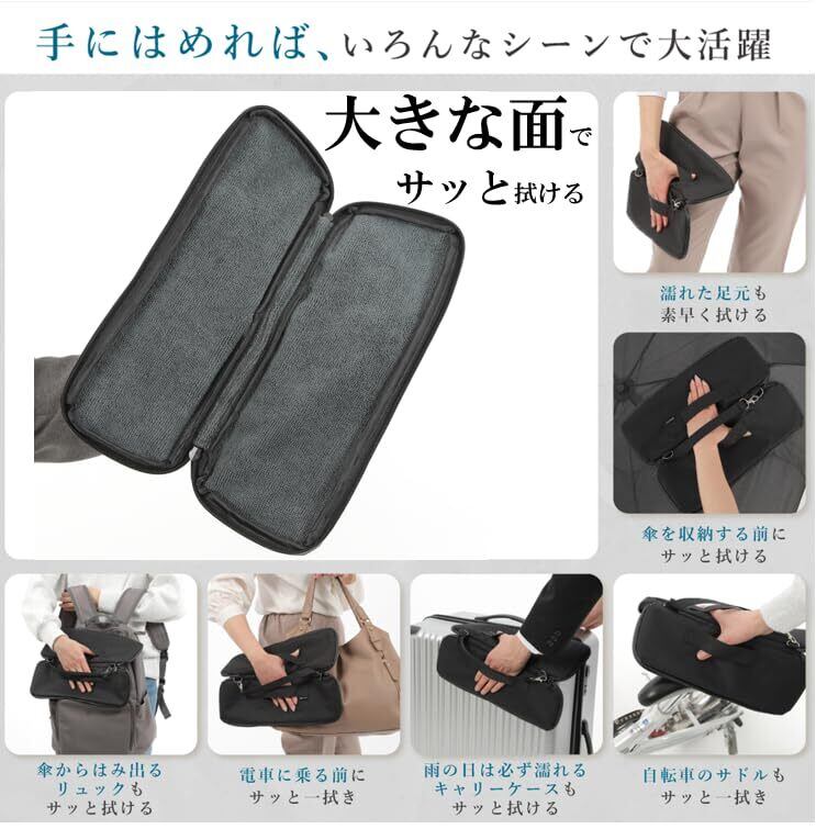 「この傘カバーは、マイクロファイバーを使用しており、濡れた傘の水分をしっかり吸収します。急な雨で濡れた傘を持ち運んでも、バッグやポケットを濡らすことはありません!」