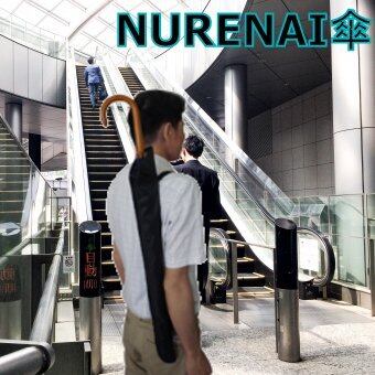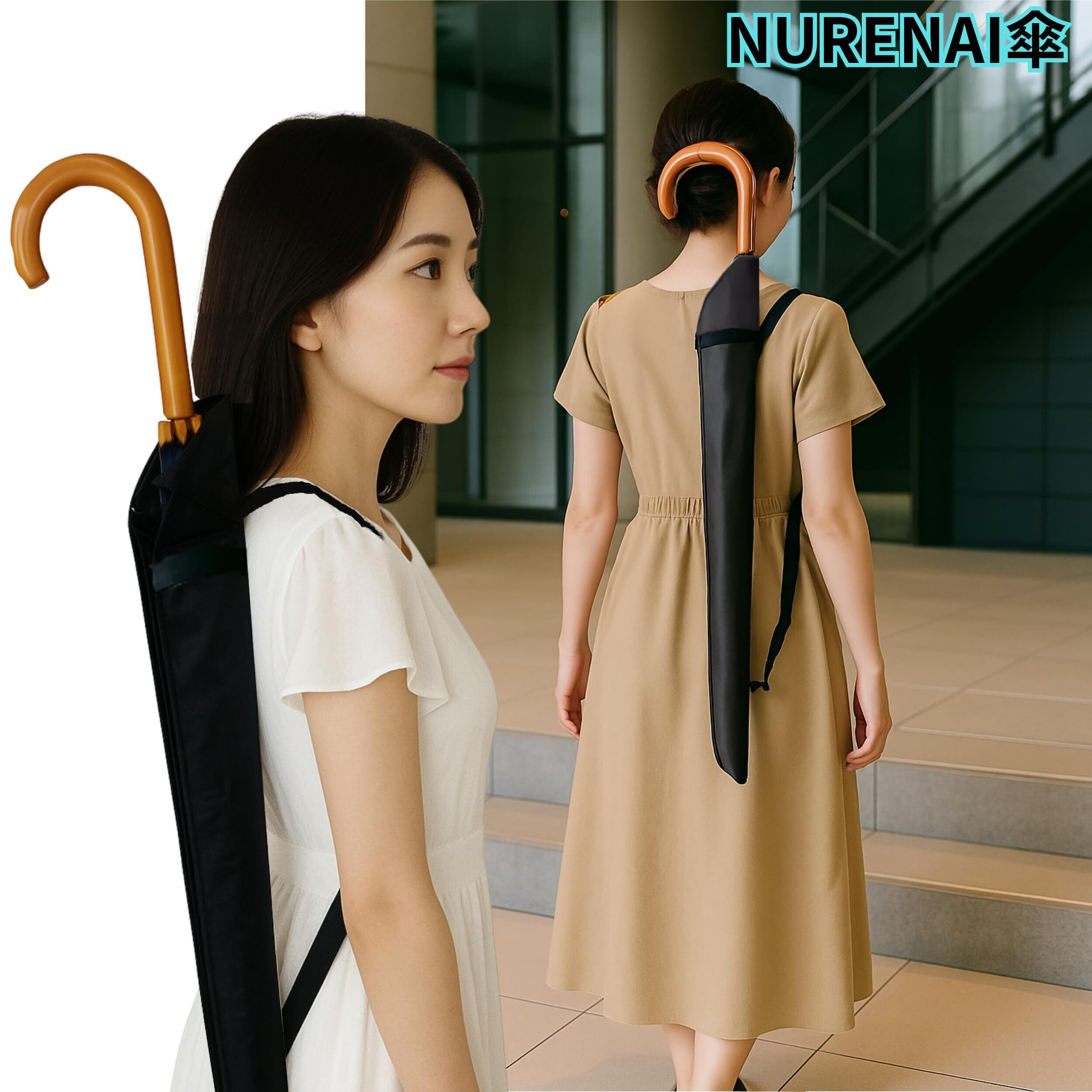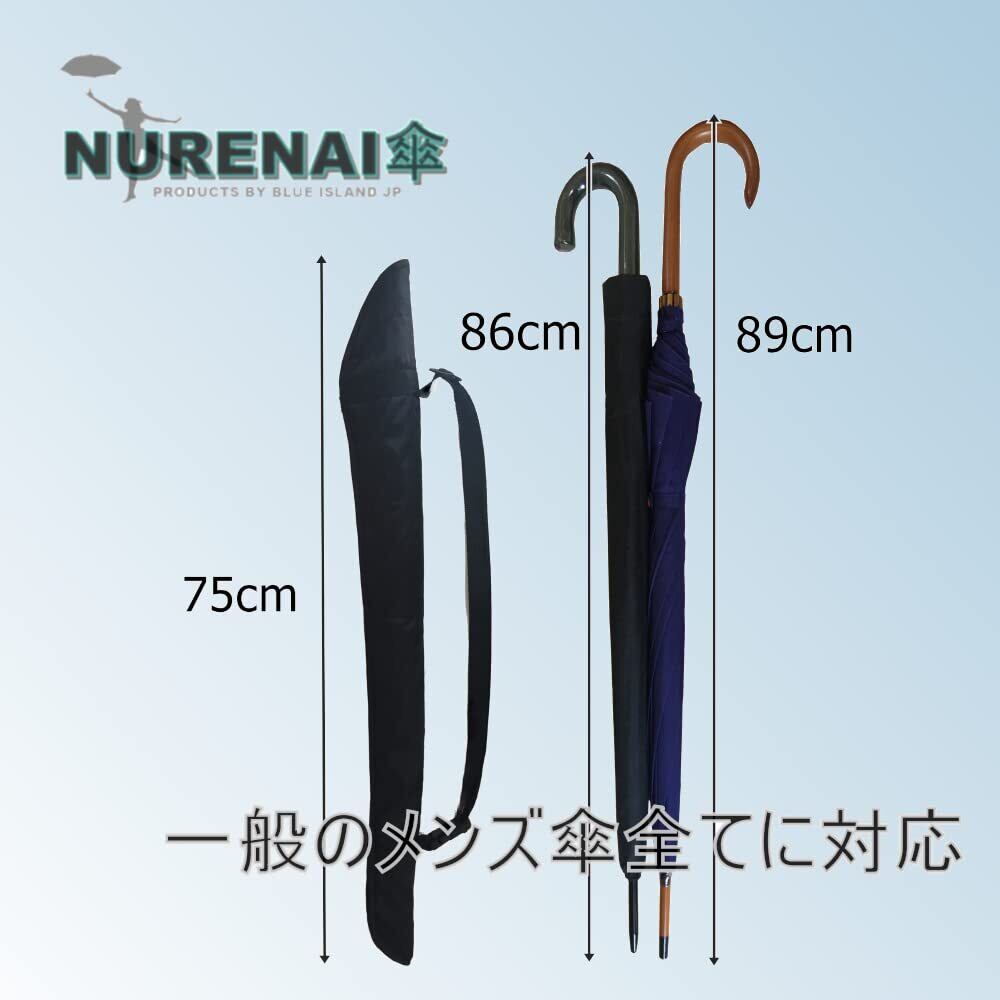 「『NURENAI傘カバー』は、長傘専用に設計されたマイクロファイバー製のカバーで、便利さと機能性を兼ね備えたアイテムです。75cmのロングタイプで、しっかりと濡れた傘を包み込むことができます。肩掛けスタイルで持ち運びも快適です!」