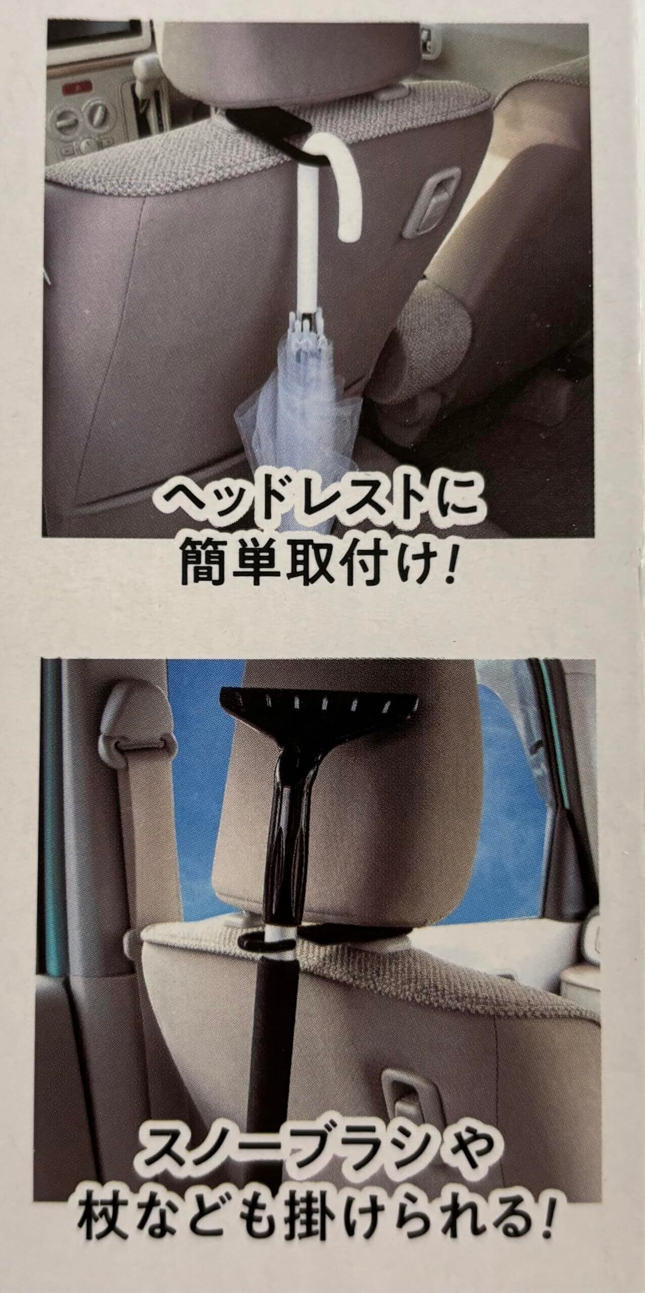 「『ヘッドレストに簡単取り付け!シート傘ホルダー』は、車のヘッドレストに簡単に取り付けられる便利なアイテムです。直径2cmの傘や柄杖も収納でき、耐荷重1kgの設計で安心してお使いいただけます!」