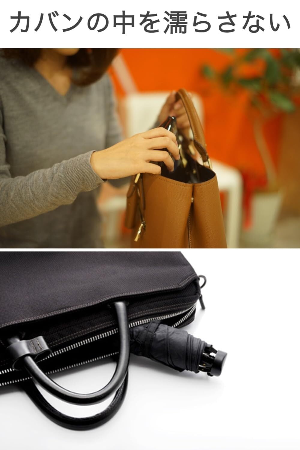 「防水加工が施されているため、傘をしまったままでも安心です。傘の水滴が漏れ出さないので、他の持ち物を濡らす心配もありません。」