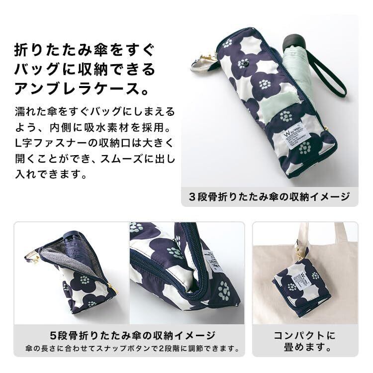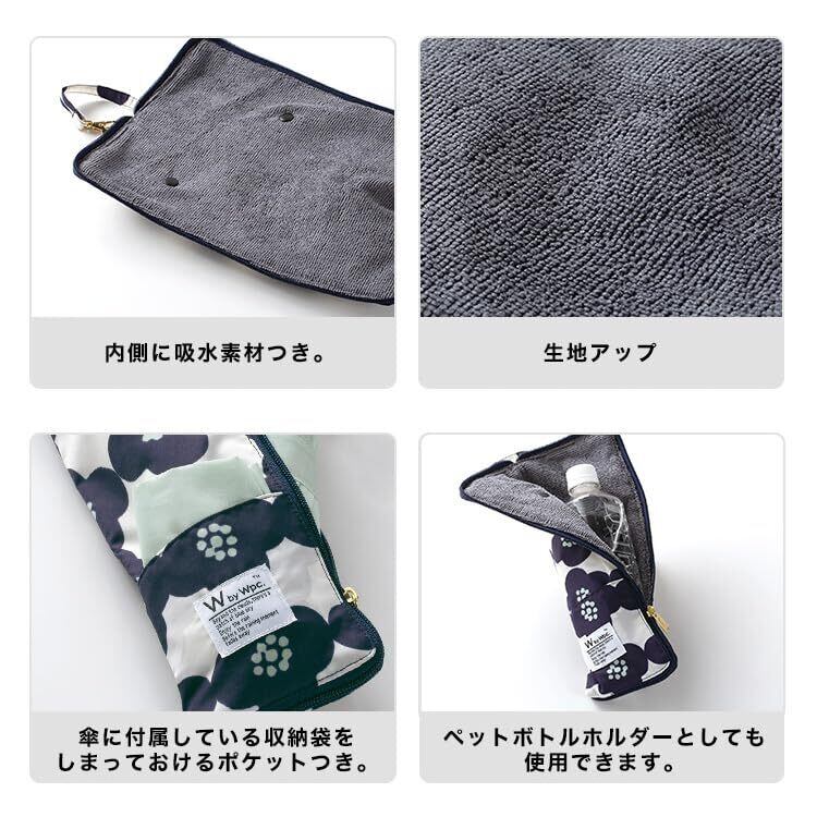 「特殊な素材を使用しており、傘を収納した時に水分をしっかり吸収し、バッグや他の持ち物を濡らすことがありません。また、はっ水機能も備わっており、急な雨でも安心して大切な傘を守ることができます。」