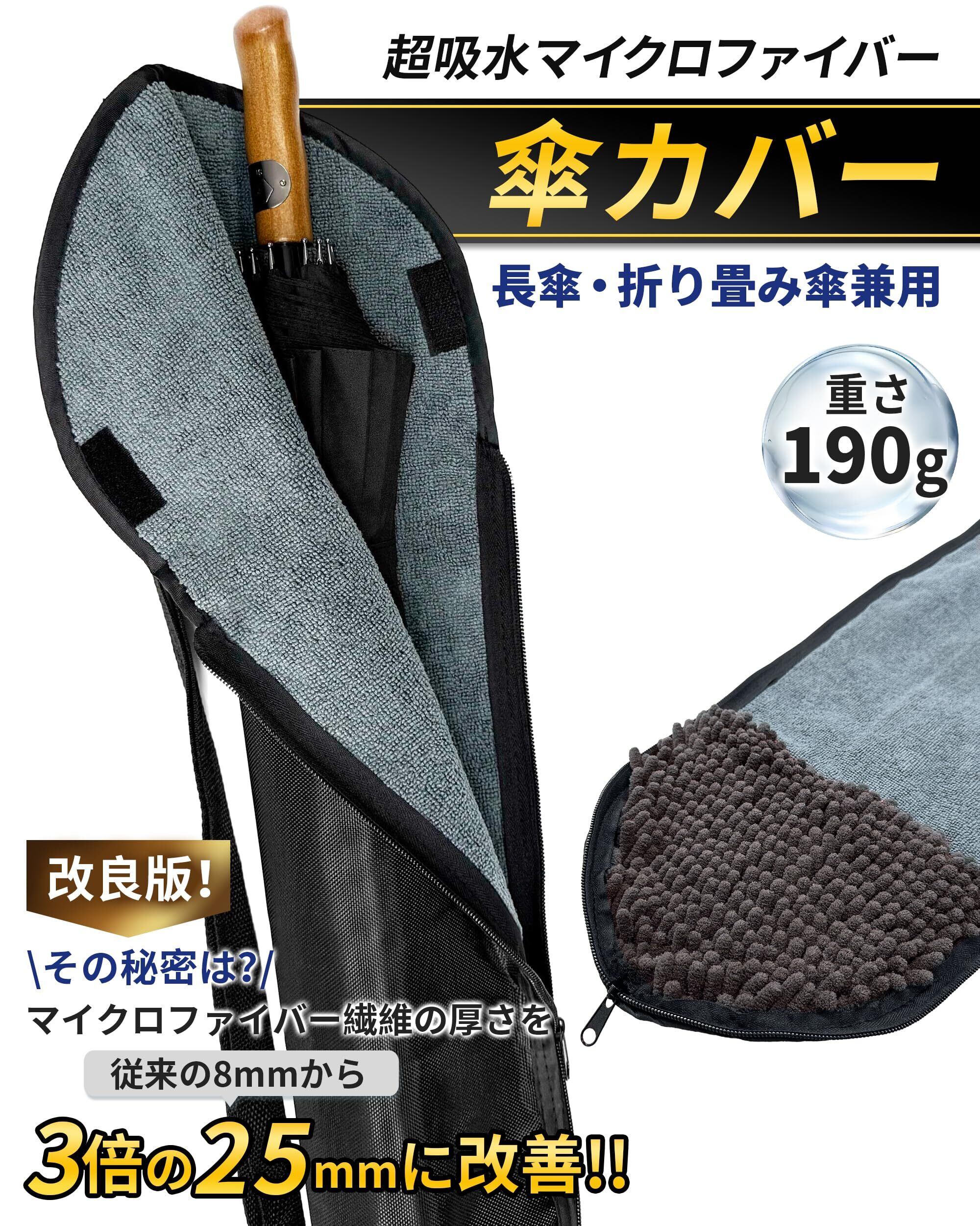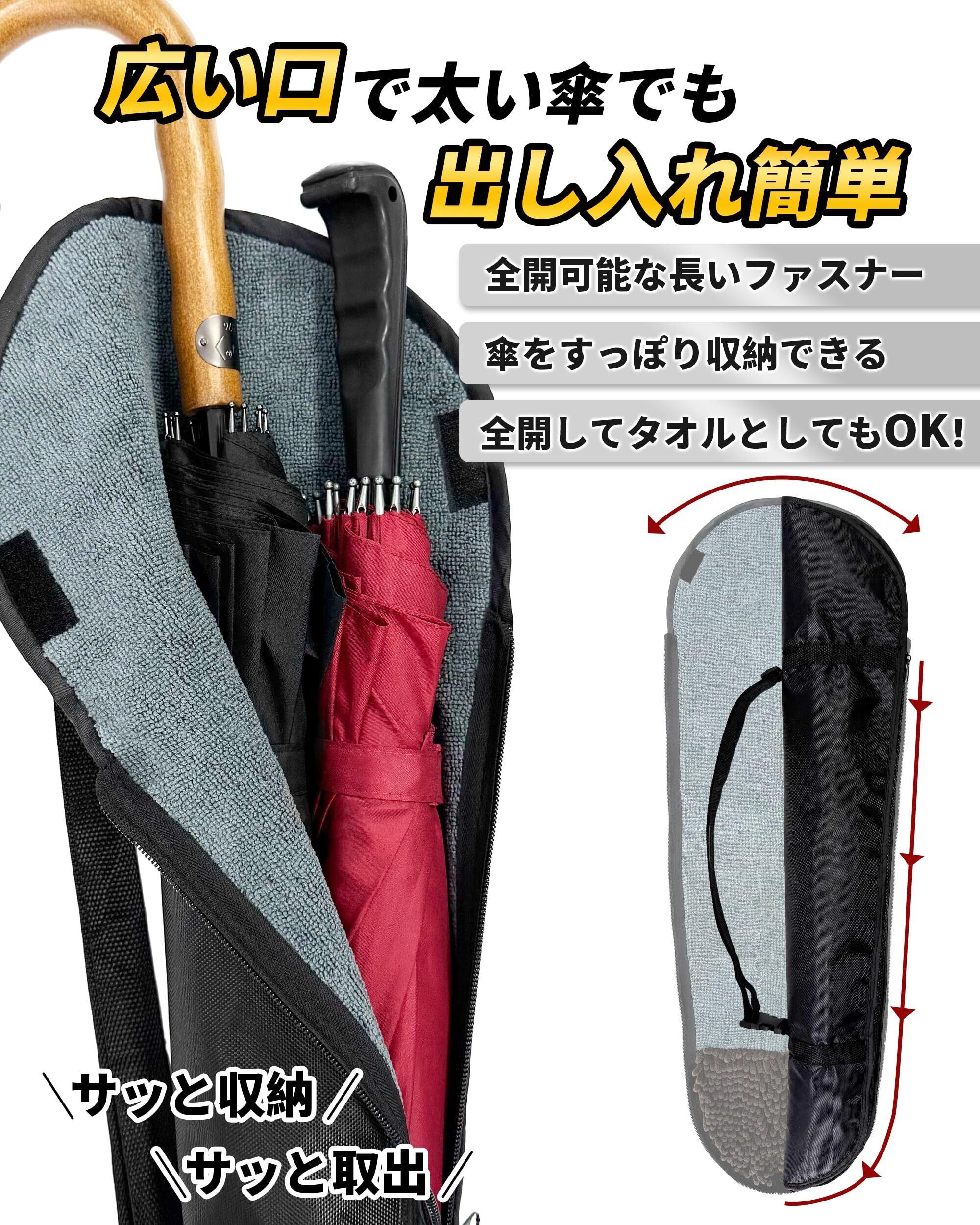 【長傘・折り畳み傘兼用・長いファスナー設計】 サイズ2タイプ(85cm×15cm/190g、75cm×12cm/150g)で全ての傘に対応。太い傘も広い開口部から出し入れ簡単。全開可能な長いファスナー設計で、傘を包むだけでなく、内側のマイクロファイバーをタオルとして活用可能。吸水後も短時間で乾燥。湿ったまま放置してもカビにくく、繰り返し清潔に使えます。