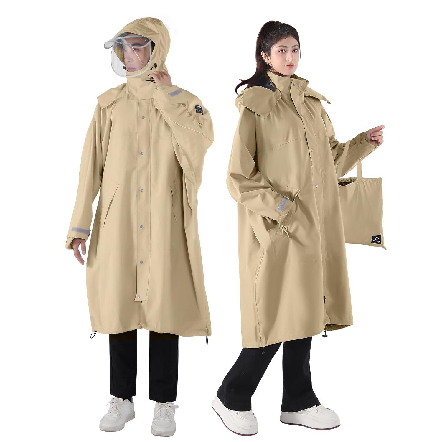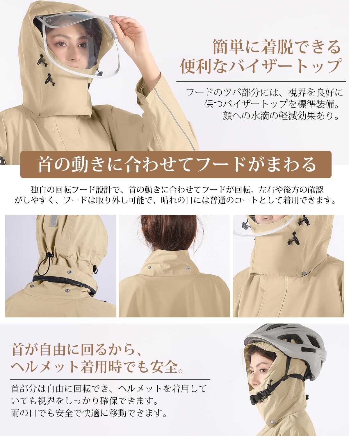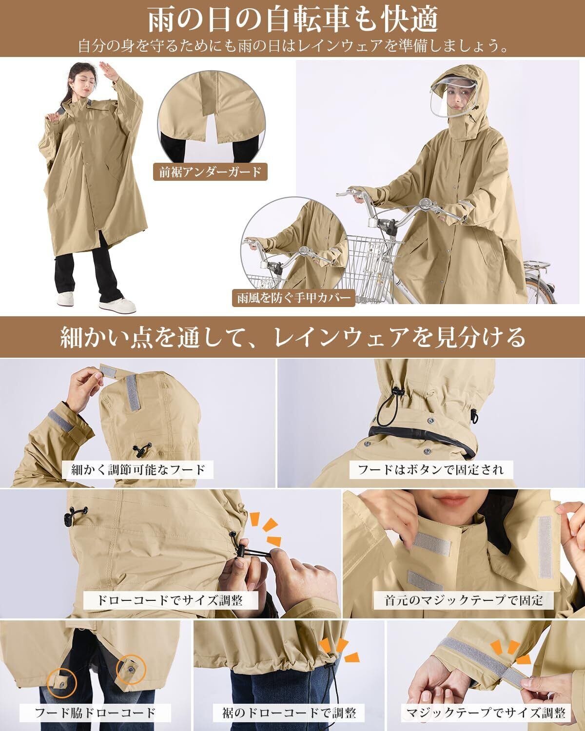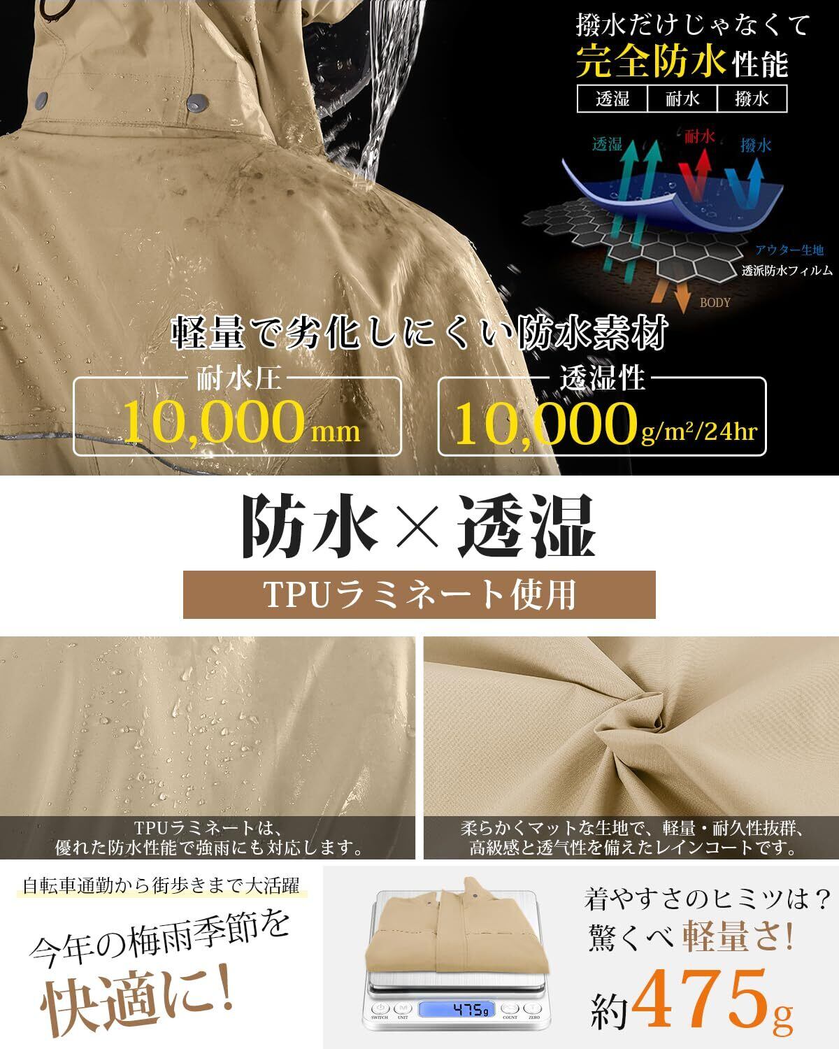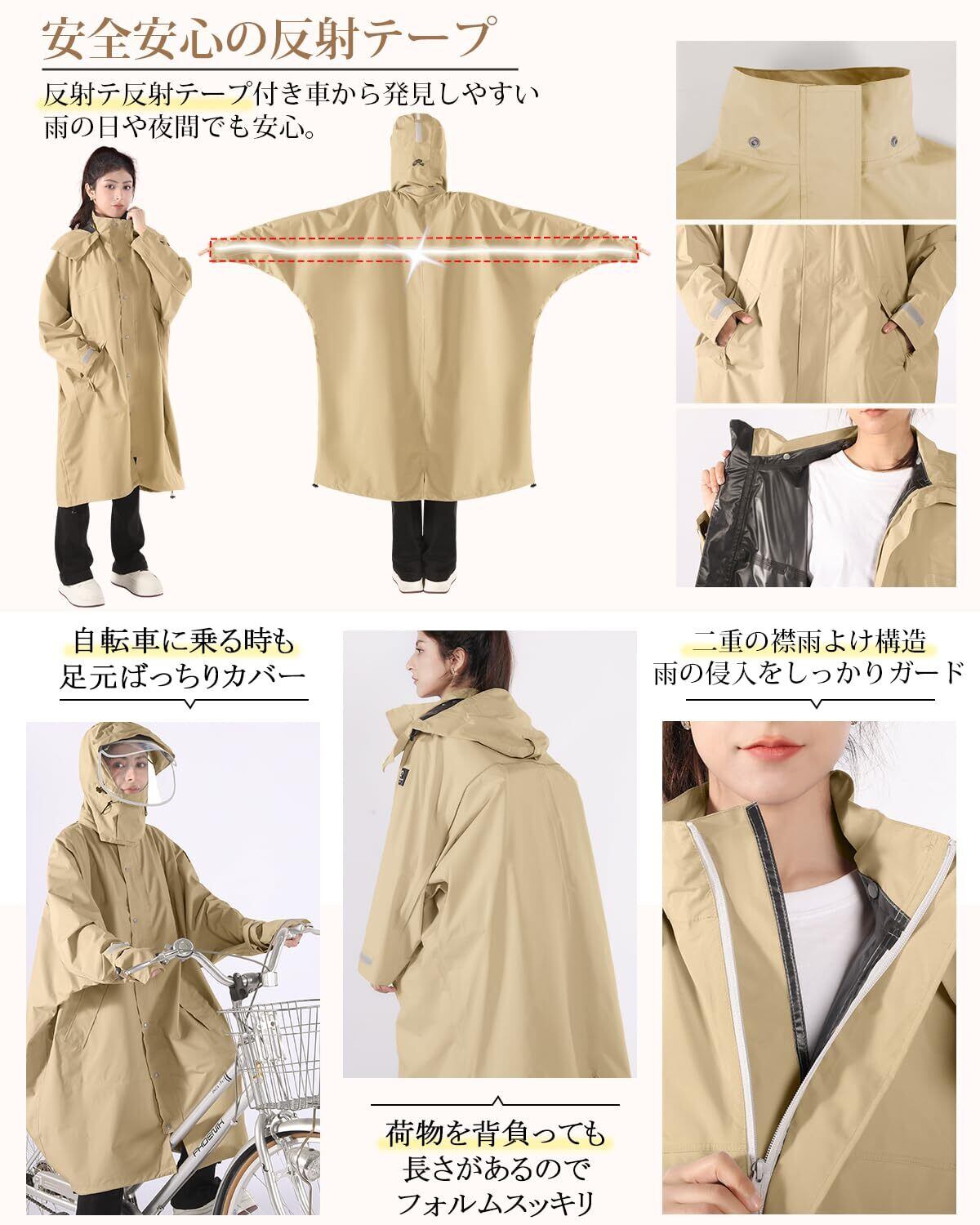 「ロングサイズのデザインが特徴で、体全体をしっかりと覆い、雨水から守ります。リュックも対応できる仕様なので、自転車移動時にも便利です。防風防水性が高く、シーンに応じた快適な着心地を提供します。」