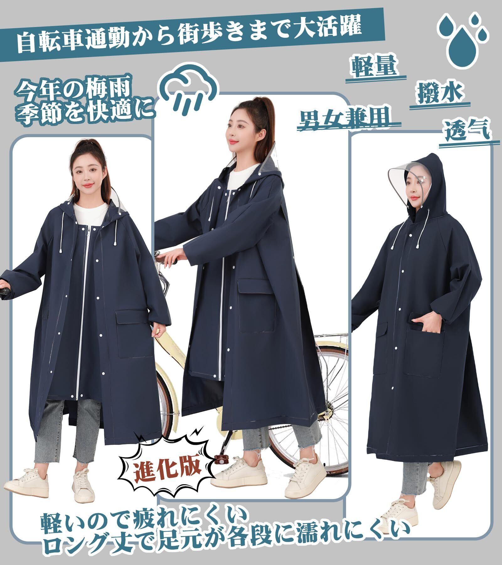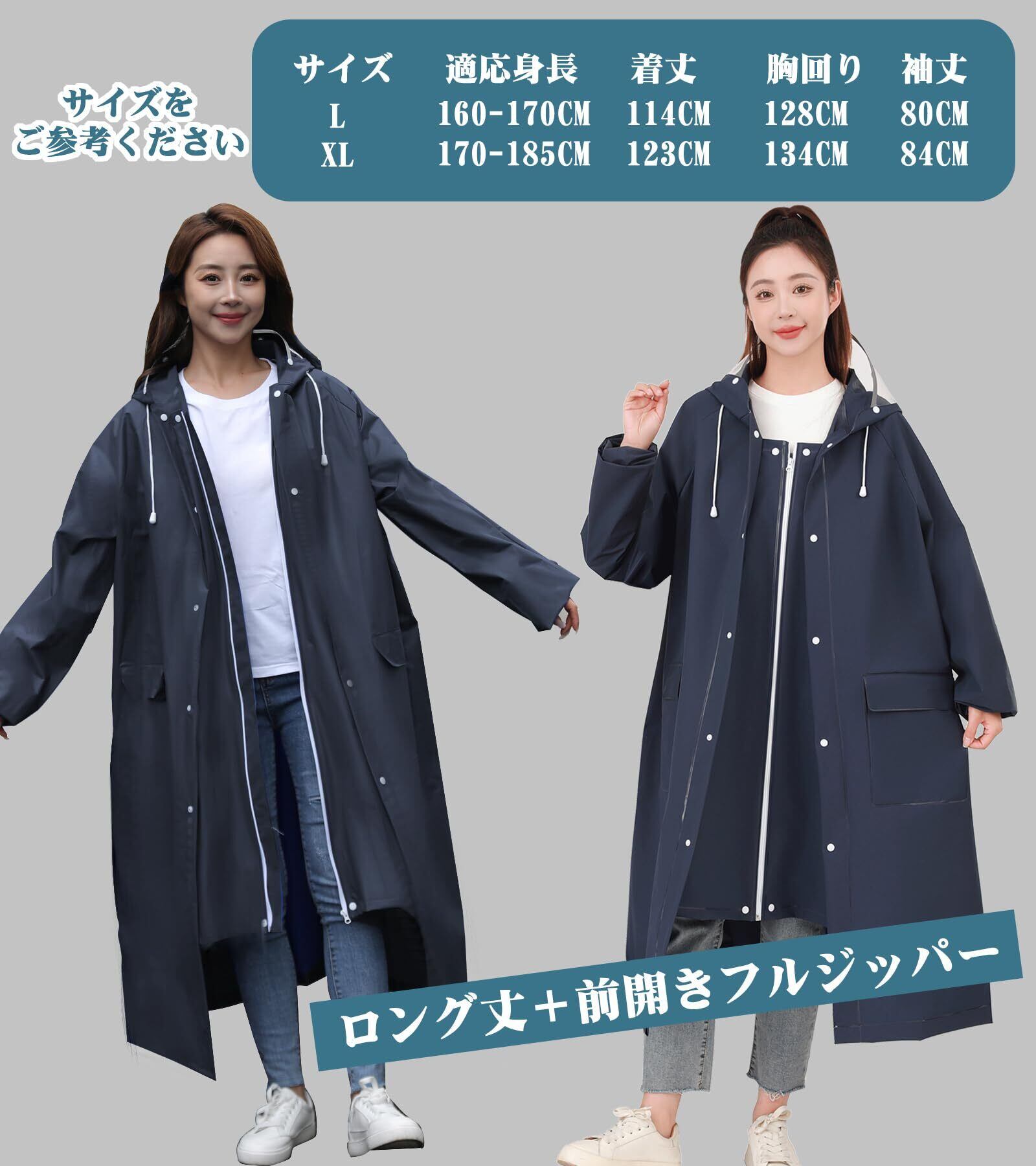 「このレインコートは、優れた防風性と防水性を持ち、急な豪雨や強風からあなたを守ります。長さがあるため、足元までしっかりと雨から保護され、梅雨の時期でも安心してご使用いただけます。」
