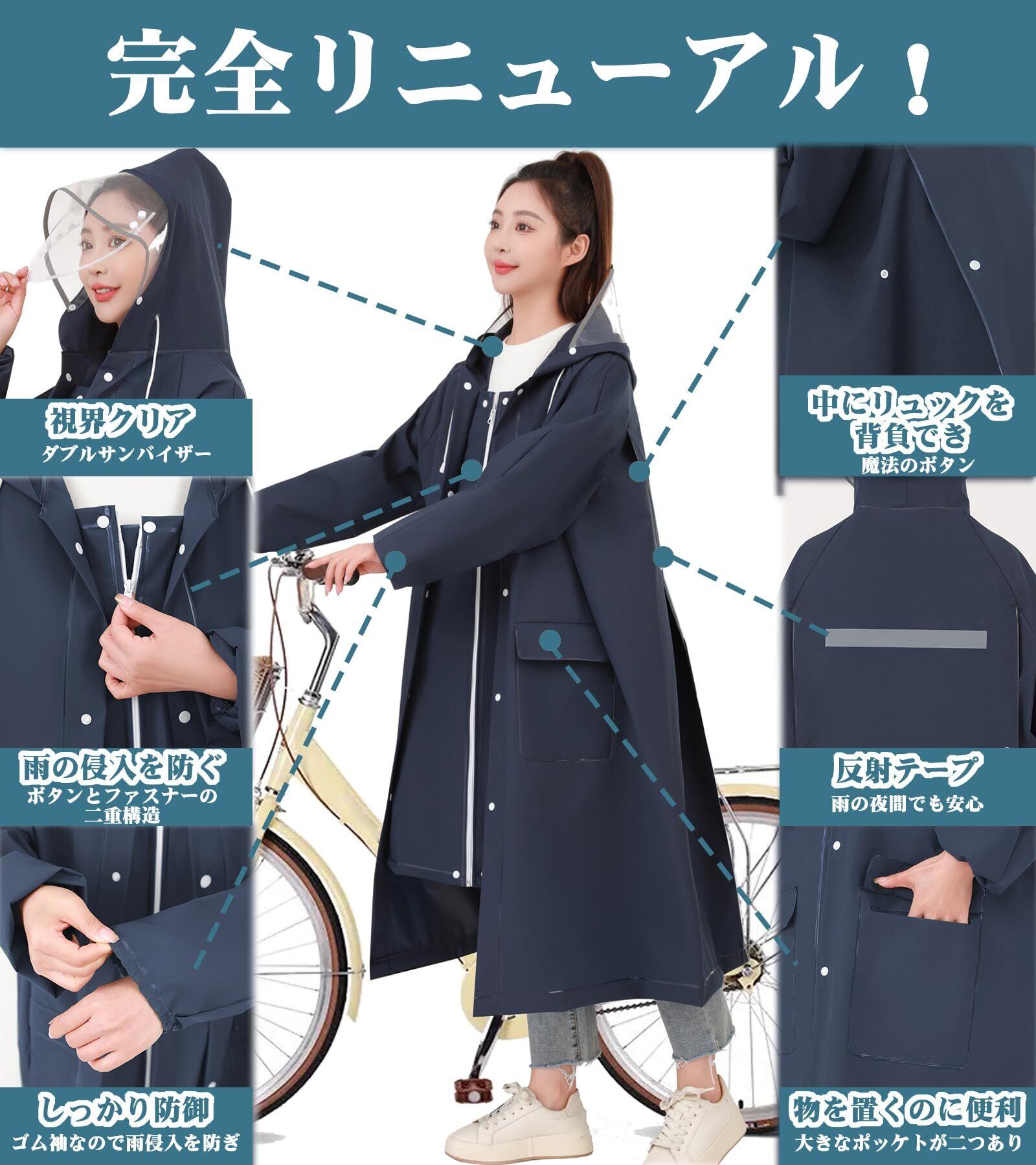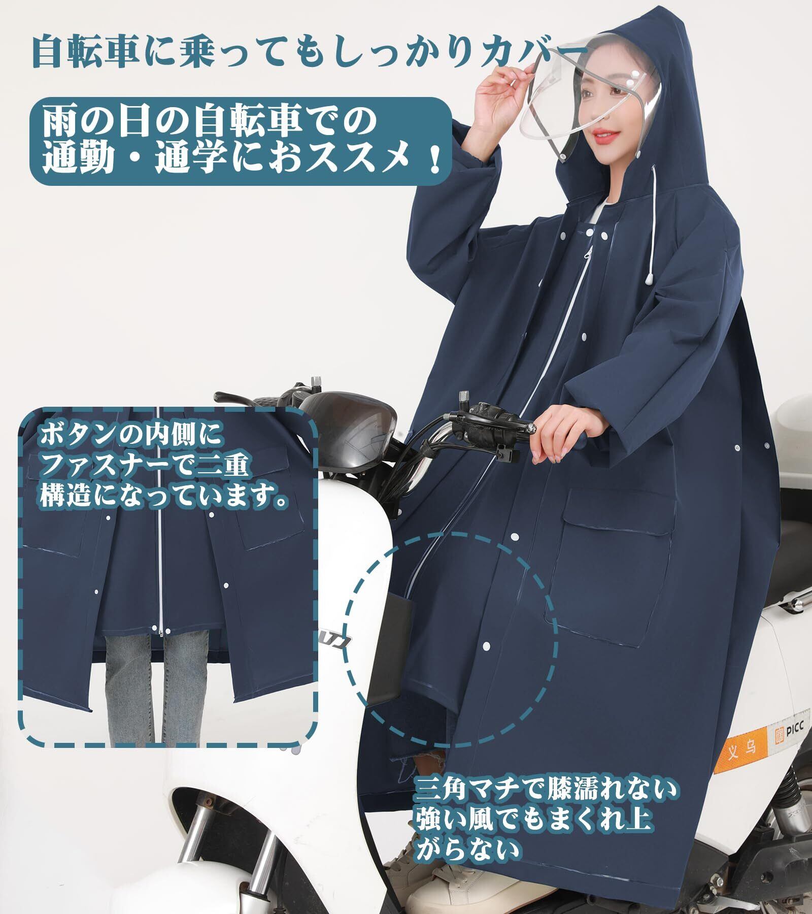 「リュックを背負ったままでも快適に着用できるデザインで、自転車移動時でも安心して使用できます。ロング丈のデザインが、全身をしっかり雨からカバーします。」