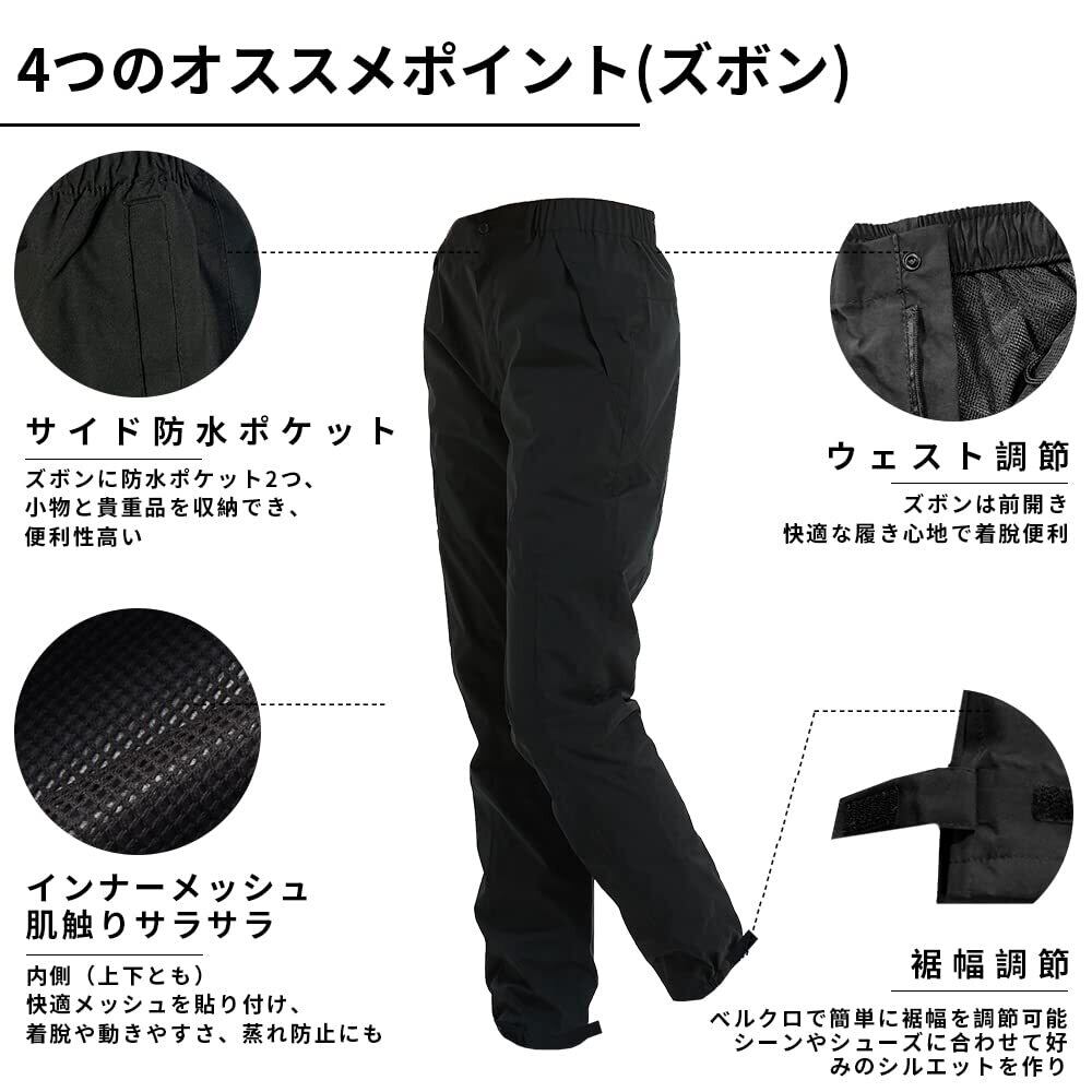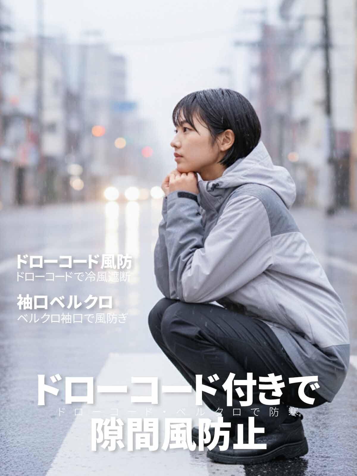【防風・防寒】上着の首元と裾に幅が調節できるドローコードが付いていて、隙間風を防ぎ暖かい着心地、しっかりと防寒してくれる仕様です。袖口はベルクロ付き、風の侵入を防ぎます。秋の肌寒さを感じ始める時期から春までに適用したレインウェア 上下セットです。