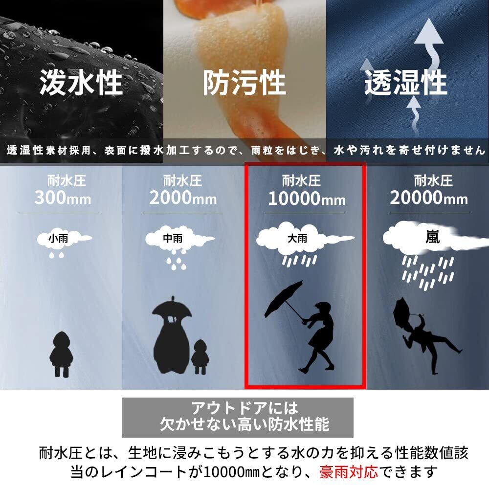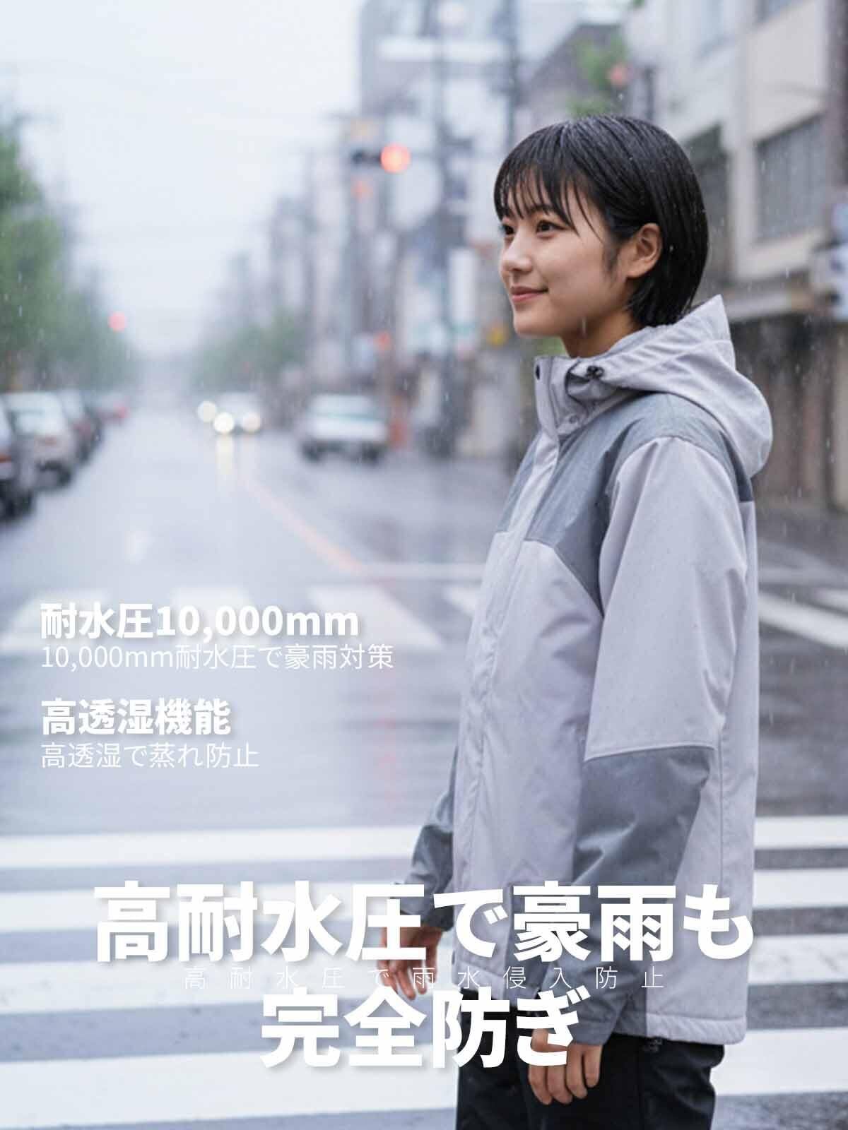「このレインコートは、高い防水性と透湿性を兼ね備えており、雨や風からしっかり守ります。耐水圧が優れているため、梅雨の時期でも安心してお使いいただける一着です。」