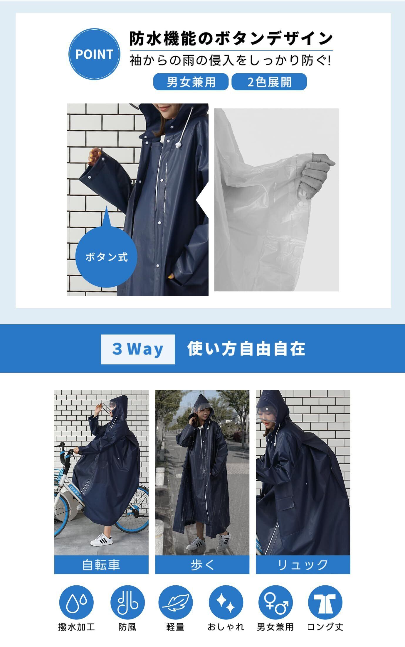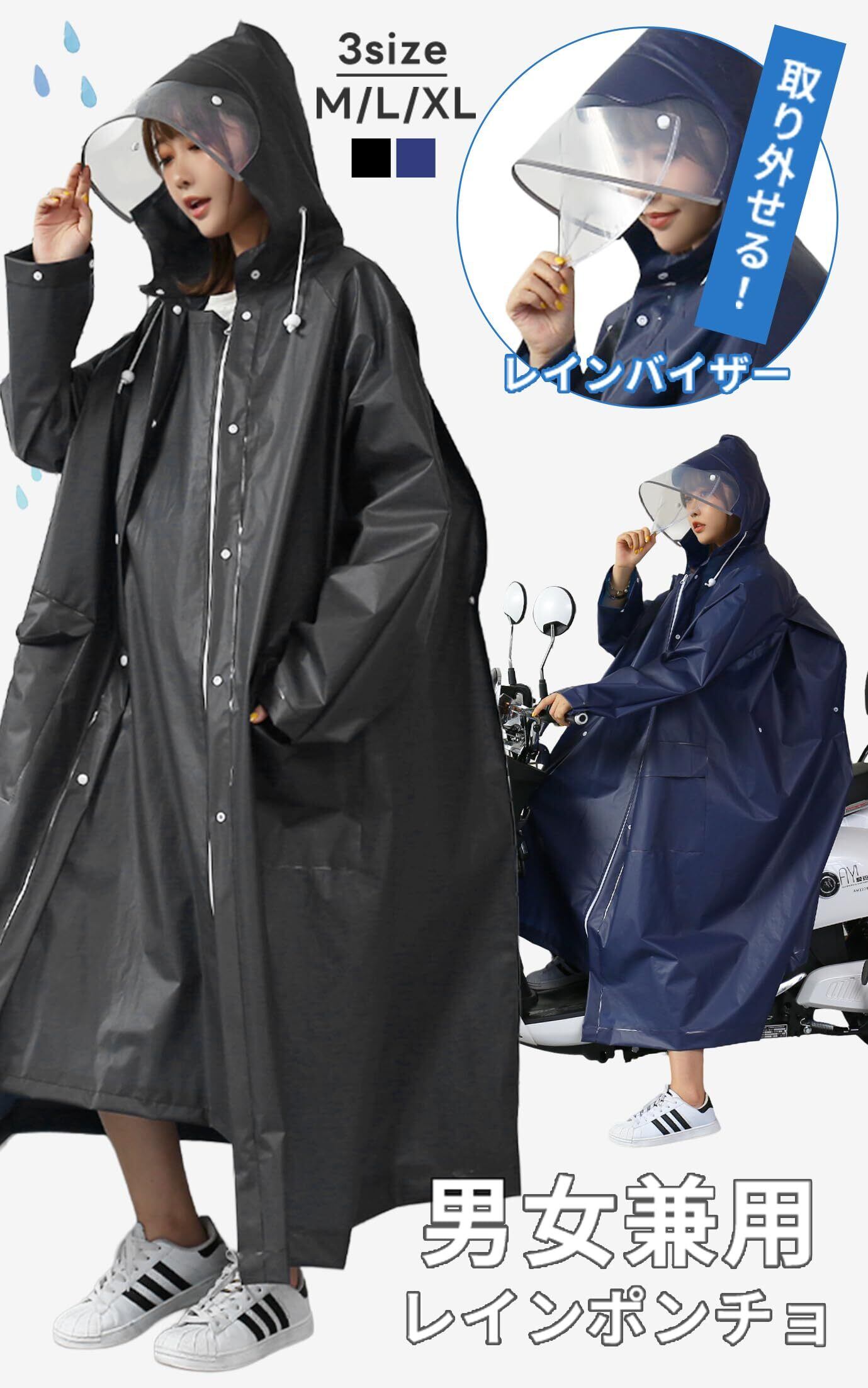 [KYOWARABE] レインコート ポンチョ 自転車 男女兼用 ロング丈 【リュック対応!取外しバイザー付き】防水 撥水 軽量 通勤通学 梅雨対策