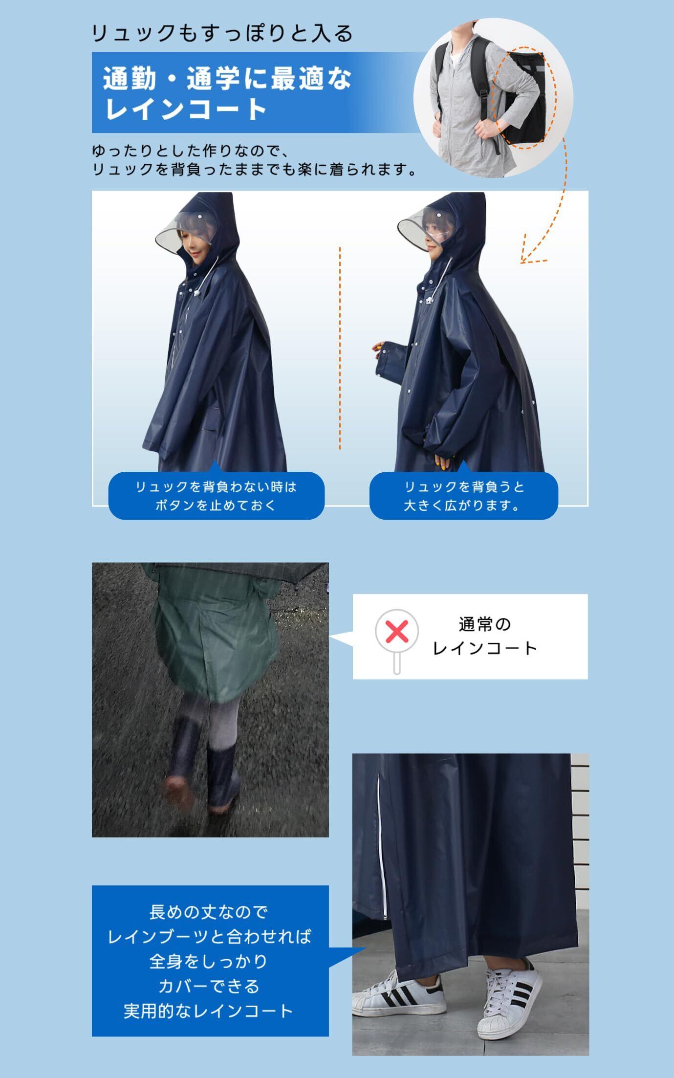 【リュック対応のゆったり設計&ロング丈】大きめのリュックを背負ったままでも楽に着用できるゆったりサイズ。膝下まで覆うロング丈設計により、レインブーツと組み合わせれば足元までしっかりカバー。通勤通学の荷物が多い方にも最適な実用的デザイン