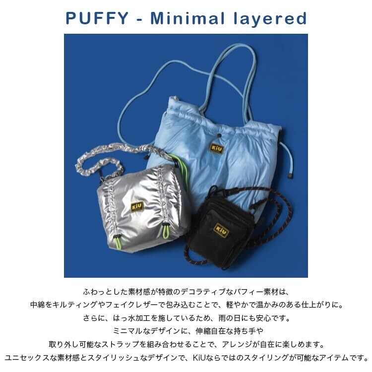 【上質なツヤと軽やかさ。毎日に寄り添うパフィースクエアバッグ】 今日はどこへ行こう。空模様も気分も、自分らしく楽しめるように。KiUのバッグは、軽やかに、そっと寄り添う。 従来のPUFFYシリーズを生地から刷新し、より高級感のある仕上がりに。ダウンジャケットのようなふっくらとした質感と、ツヤのある素材感が魅力のハンドルバッグです。 中綿入りでクッション性があり、柔らかな肌あたりで肩掛け時にも体にやさしくフィット。はっ水加工を施しているため、ちょっとした雨なら大丈夫。 伸縮性のある手持ちで持ち方のアレンジも自在。軽量設計なので、荷物が多い日のお出かけやショッピング、旅行にもぴったり。 ミニマルながら洗練されたデザインで、カジュアルにもきれいめコーデにも自然になじむ、ユニセックスで使えるアイテムです。