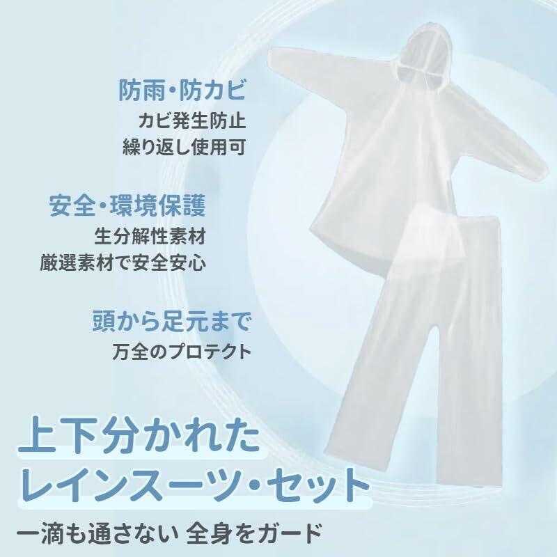 「『[WhaRainle] レインコート』は、急な雨からも安心して守ることができる、使い捨ての上下セットレインウェアです。特にキャンプや釣り、登山、ハイキングなどのアウトドアシーンや、日常の通勤・通学にも最適なアイテムです!」