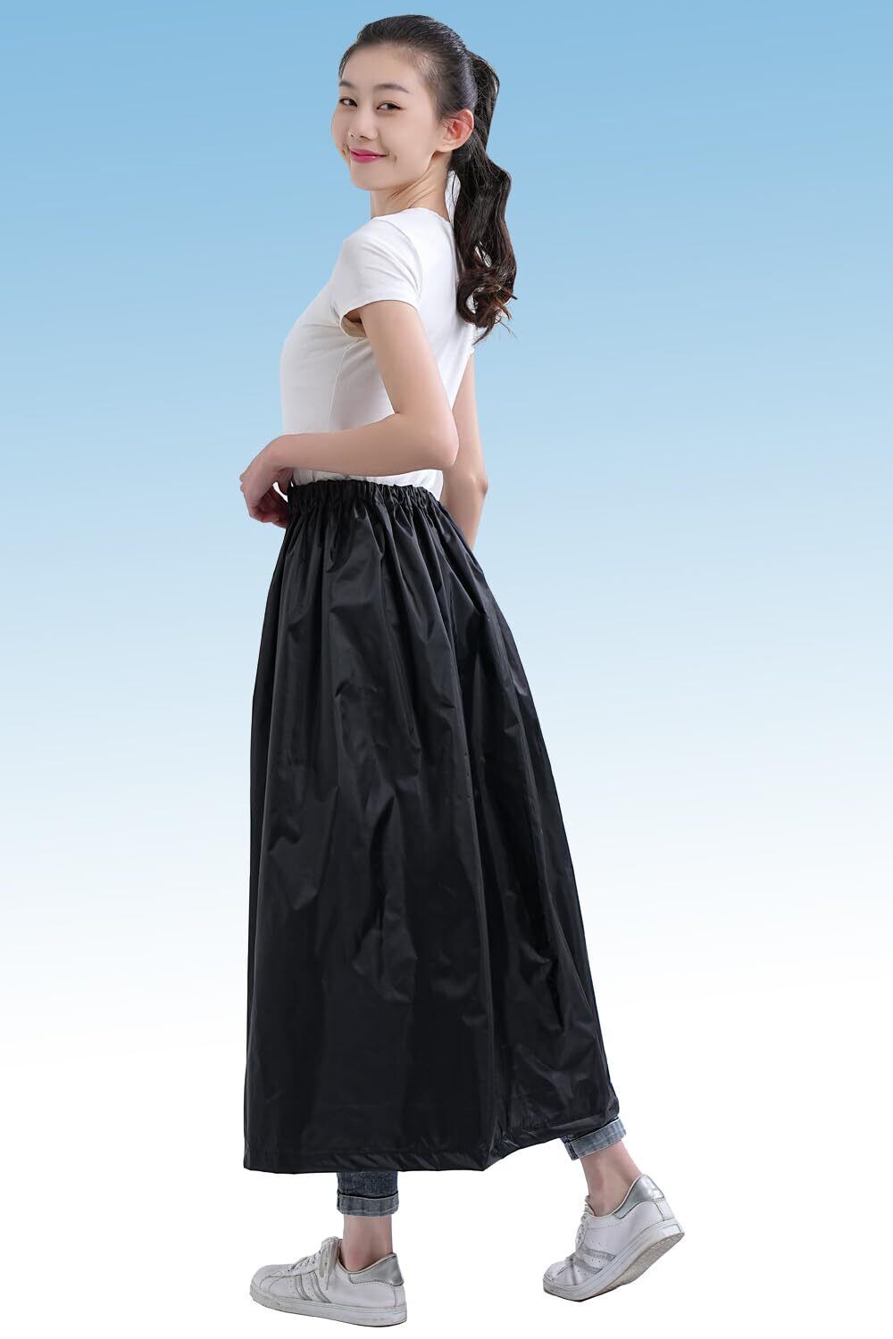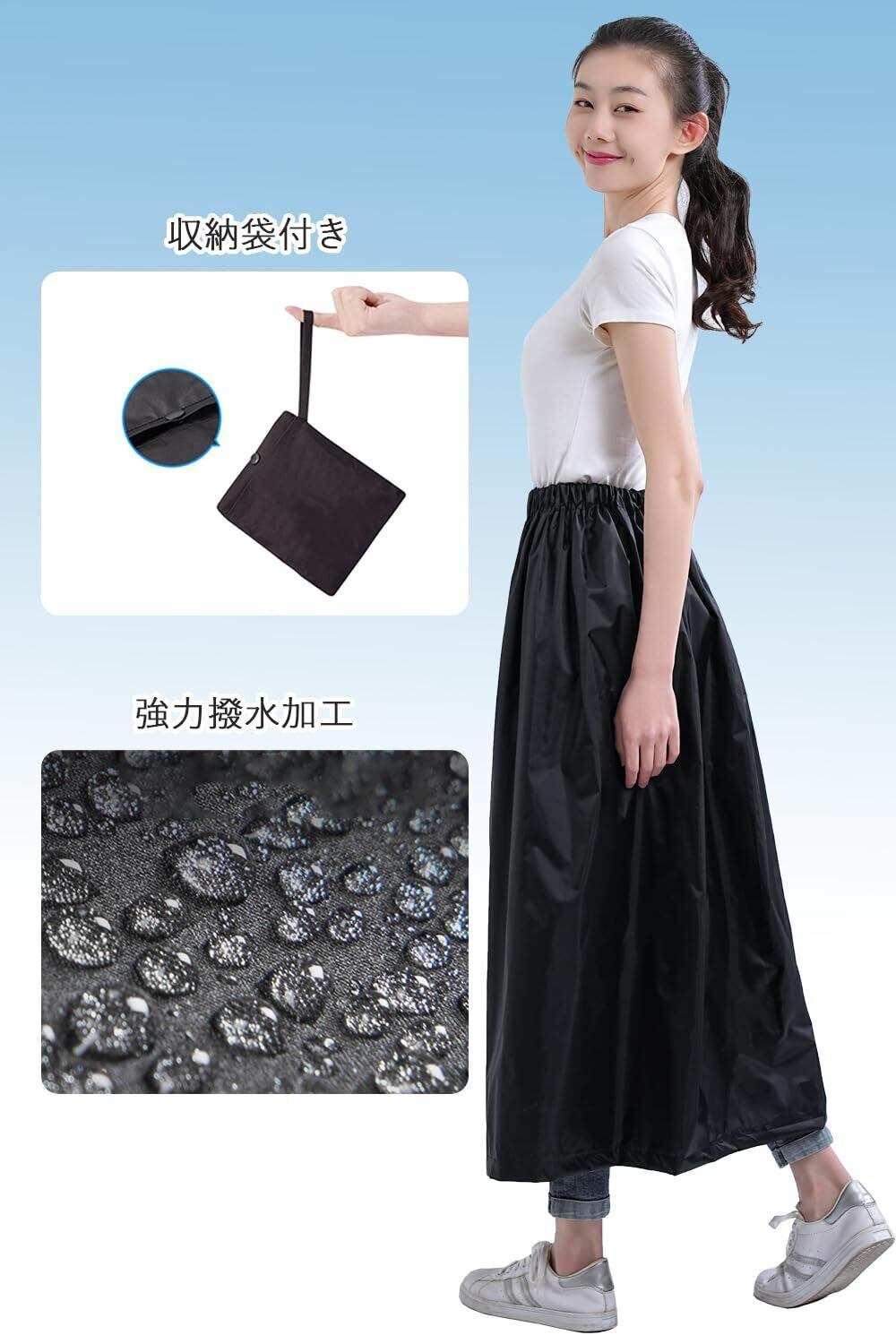 防水加工のレインスカート:雨の日の自転車通学や通勤、お出かけ時に大事なお洋服を濡らしたくない方にオススメ。 スカートやズボンの上からサッと履けてより一層雨の日も快適に。