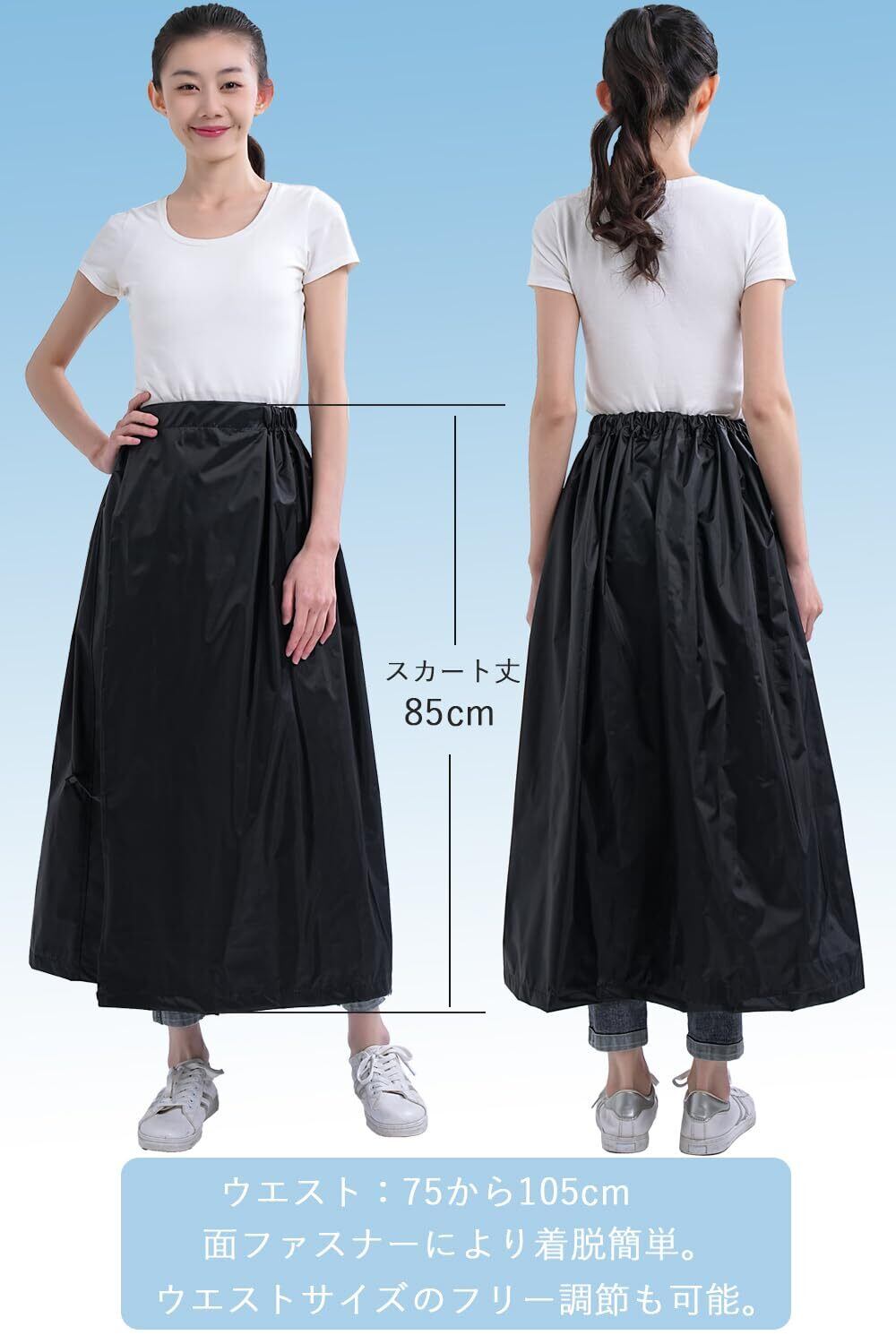 商品説明 ●サイズ:フリーサイズ(ウエスト:75から105cm スカート丈:85cm)●カラー:2色(ブラックとネイビー)よりお選びください。耐久性素材:ポリエステル(PVCラミネート) ●着脱簡単!巻スカートタイプの強力防水レインウェア。 長めのロング丈。面ファスナーにより、ウエストサイズのフリー調節が可能。