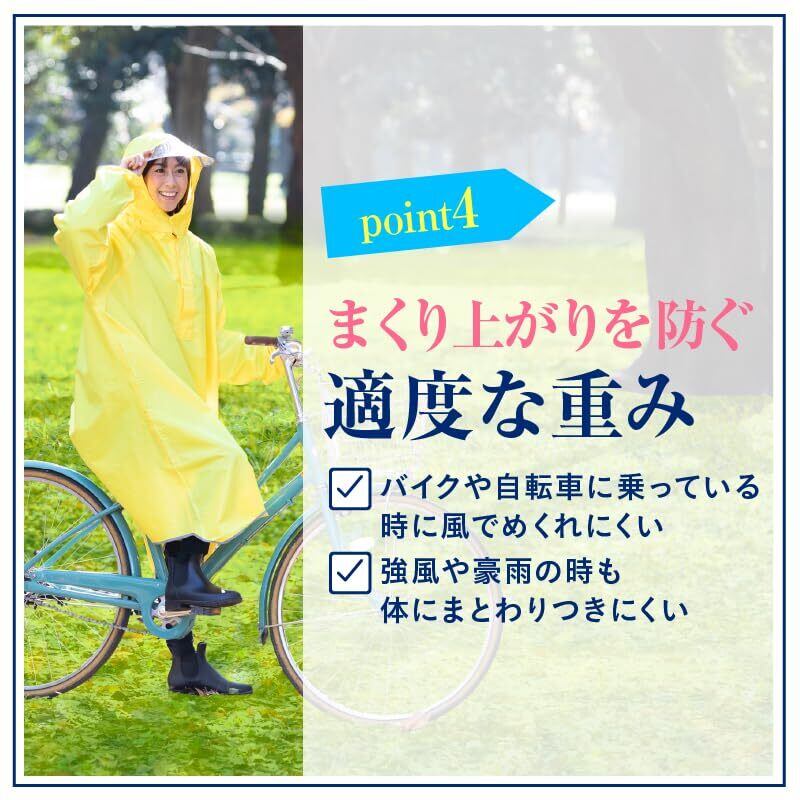 「袖が付いていることで風の影響を受けにくく、動きやすさを実現しています。自転車のハンドルをしっかりと握りながら、通学や通勤のストレスを軽減する設計です。」