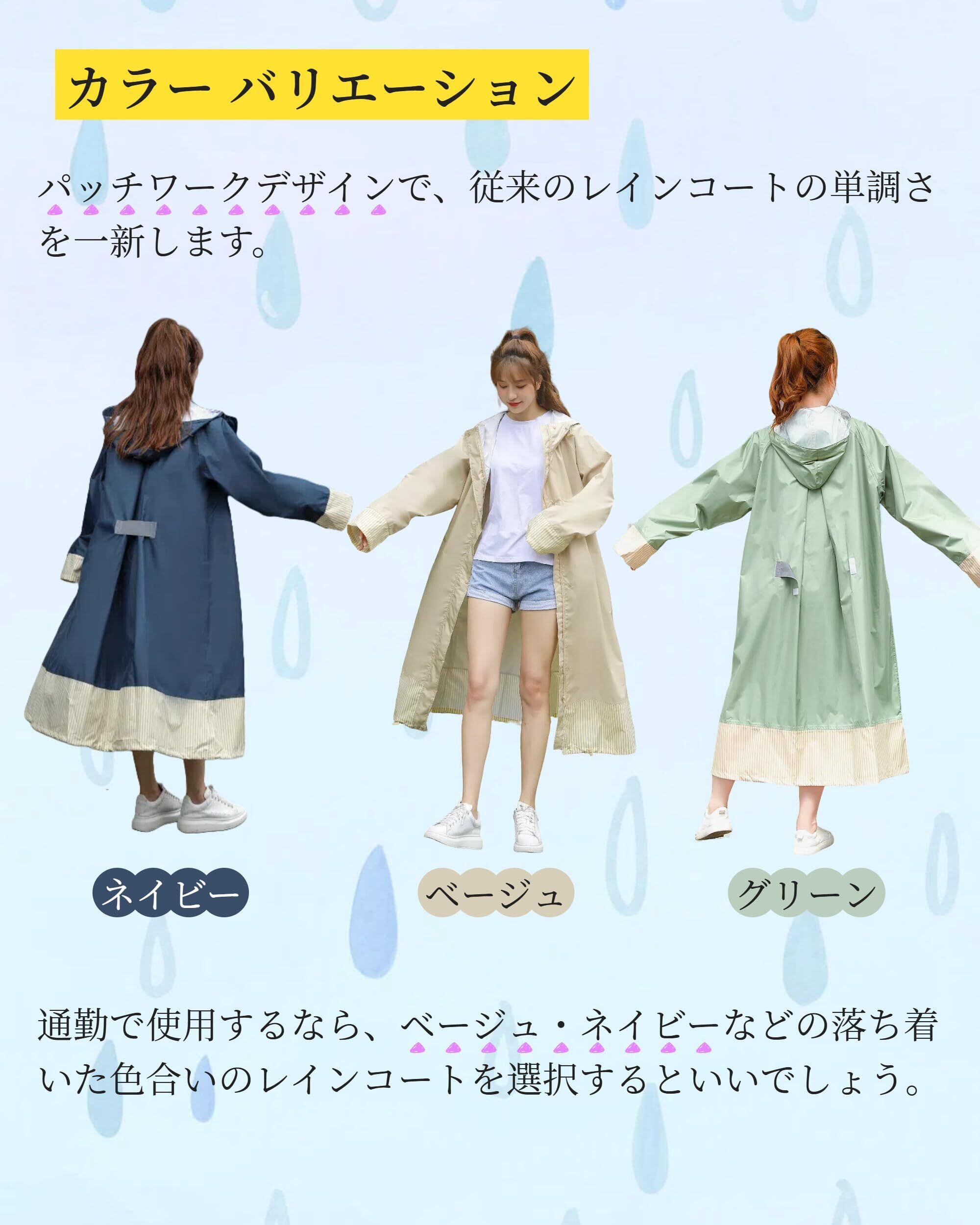 [雨の日もおしゃれに!]パッチワークデザインで、従来のレインコートの単調さを一新します。体をすっきり見せるロング丈のトレンチコートタイプのレインウエア、デザインもカラーもかわいいし、雨の日でもコーデを楽しめます。通勤で使用するなら、ベージュ・ネイビーなどの落ち着いた色合いのレインコートを選択するといいでしょう。
