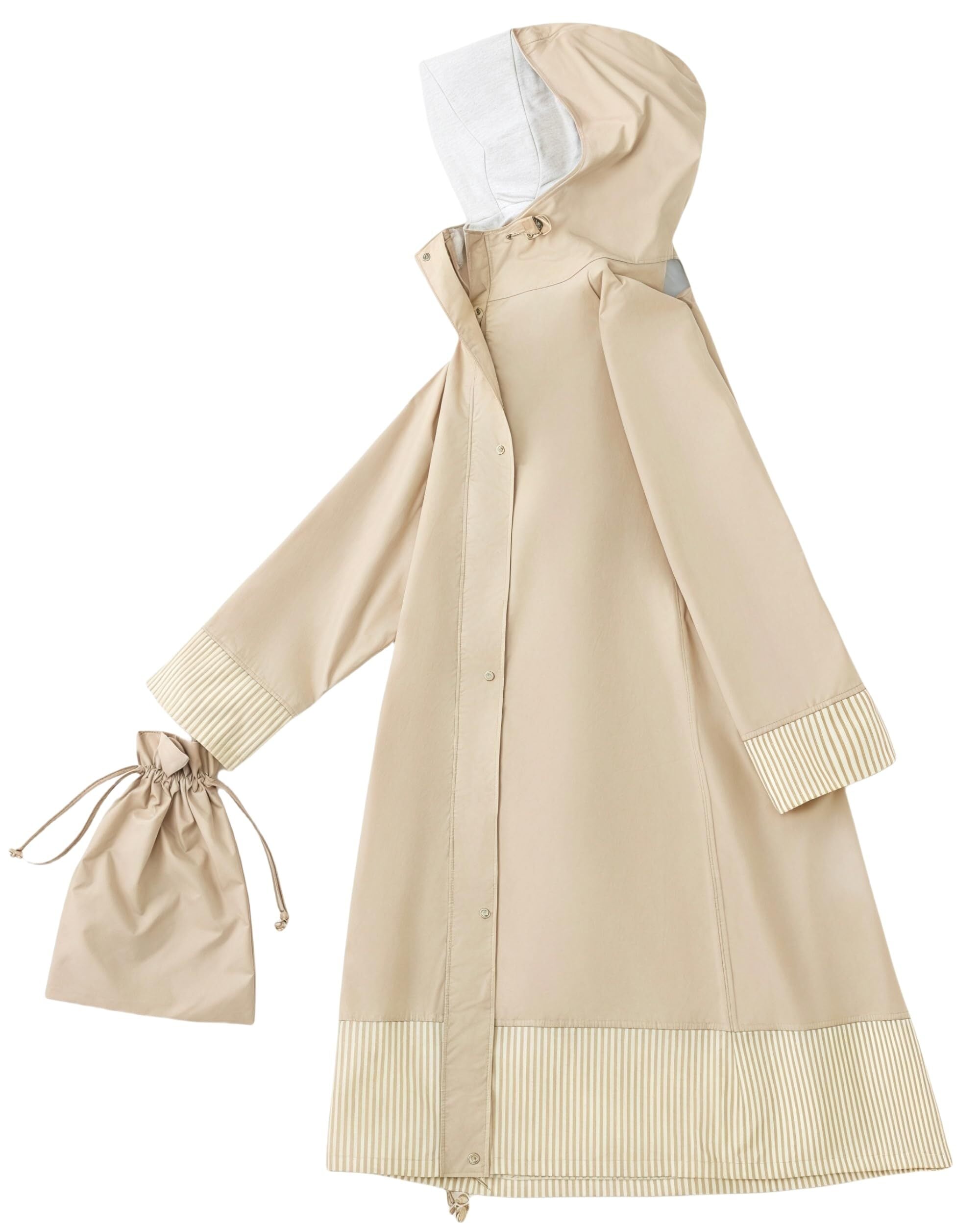 「全3色展開で、カジュアルにもフォーマルにもマッチするデザインです。あなたのスタイルに合ったレインコートを選んで、雨の日もおしゃれに過ごしましょう!」
