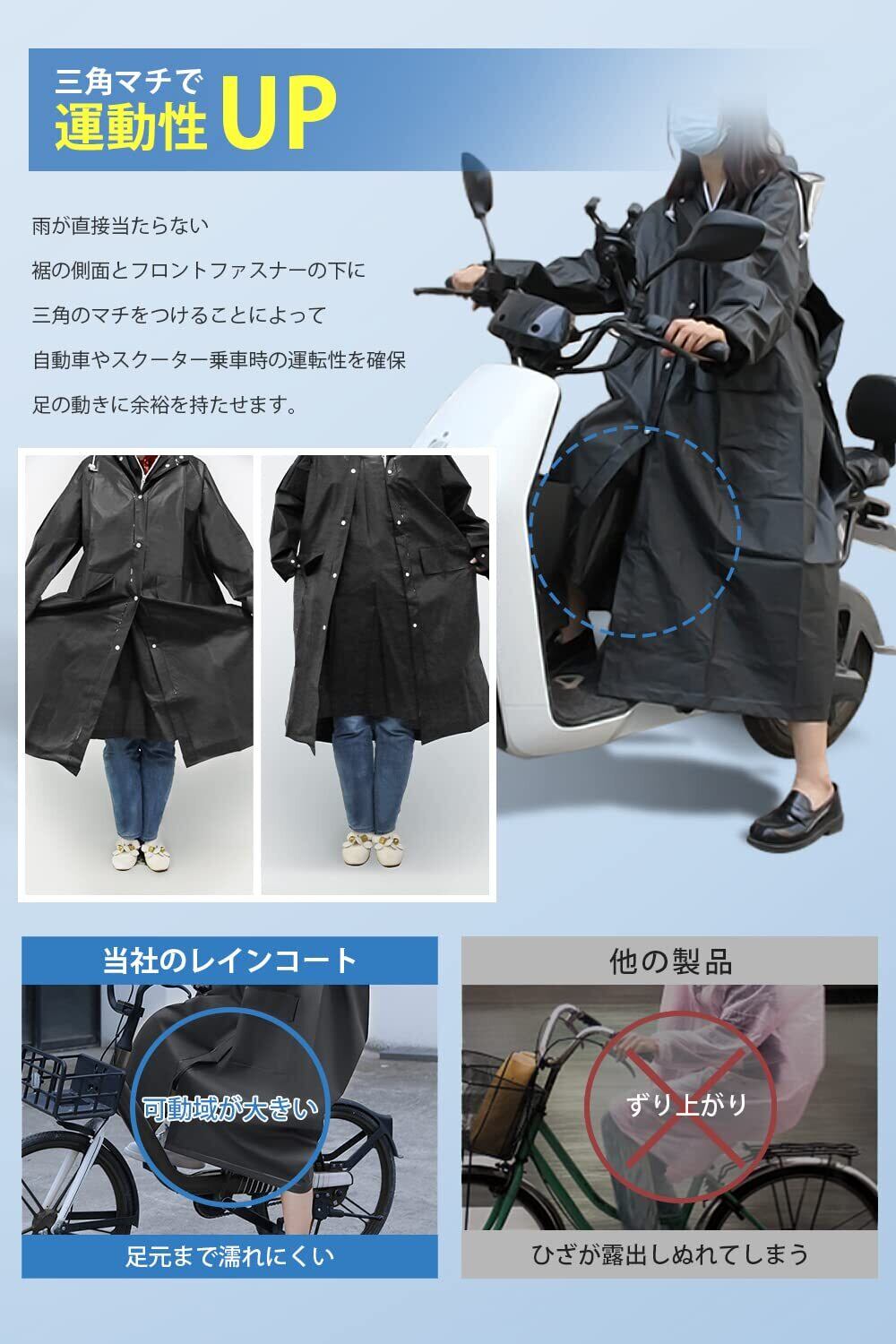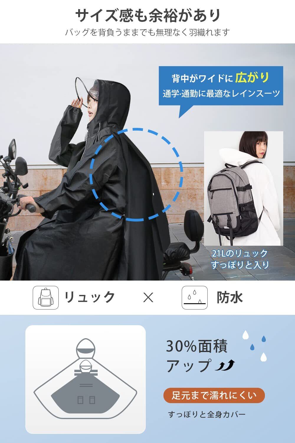 「リュックを背負ったままでも支障なく着用できる設計で、自転車に乗るときやバイク運転時の動きもスムーズです。また、ロングスタイルが全身を守り、風が強い日でも安心して着用できます。」