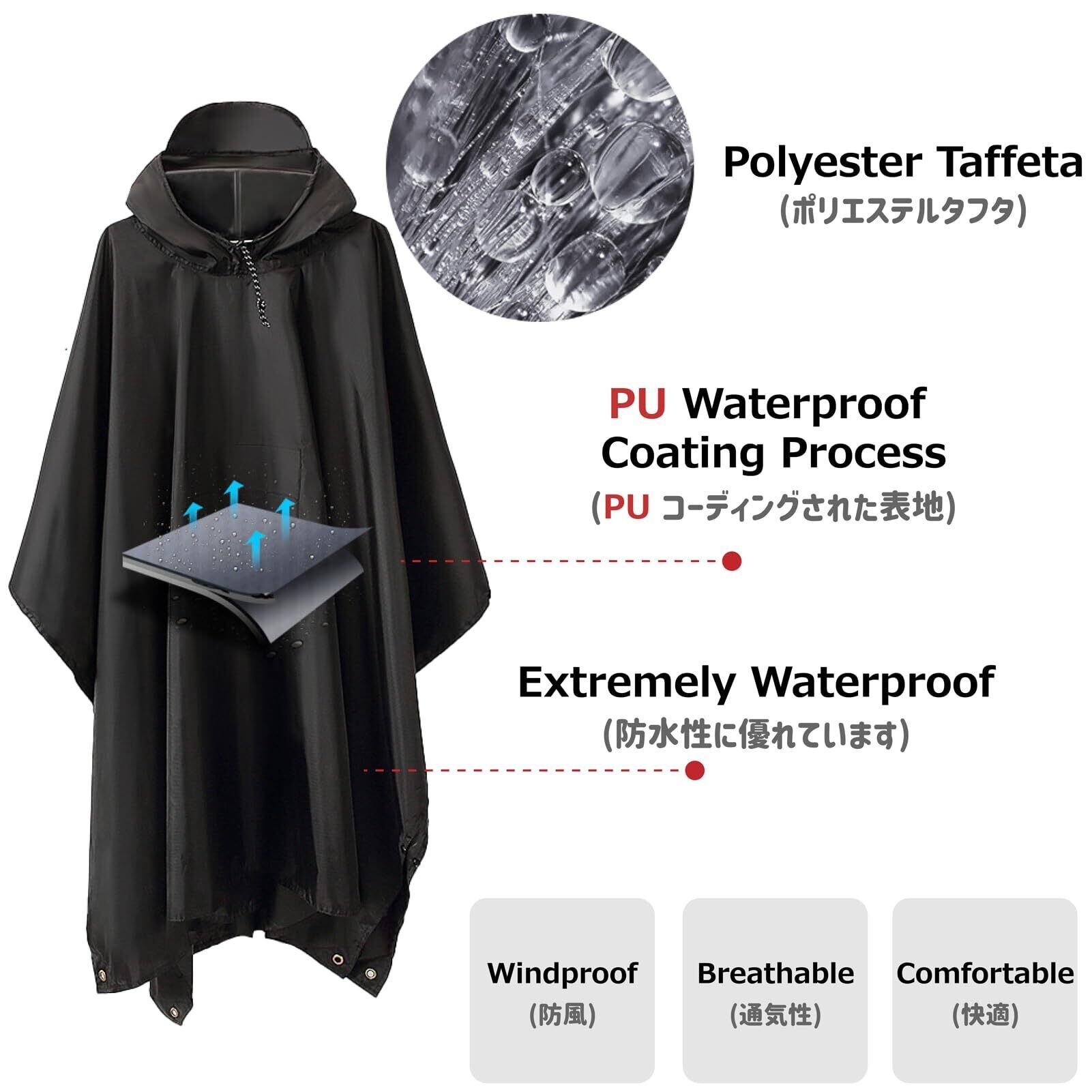【防水レインコート】100%ポリエステル生地を採用していて表地はPUコーディングされています、防水性バッチです。強化した表地は引き裂き防止で耐久です