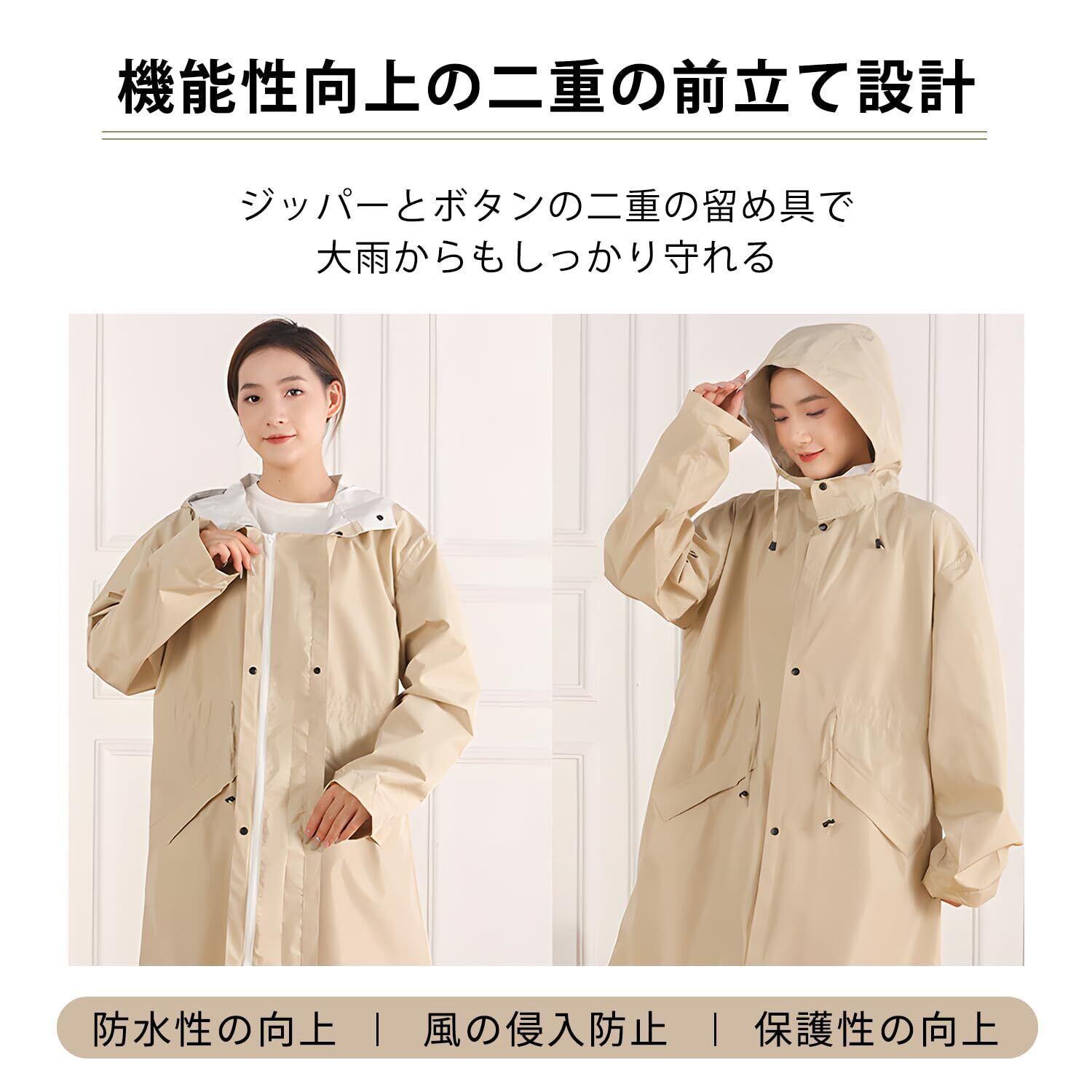 【機能性向上の二重の前立て設計】ジッパーとボタンの二重の留め具で、大雨からもしっかり守れます