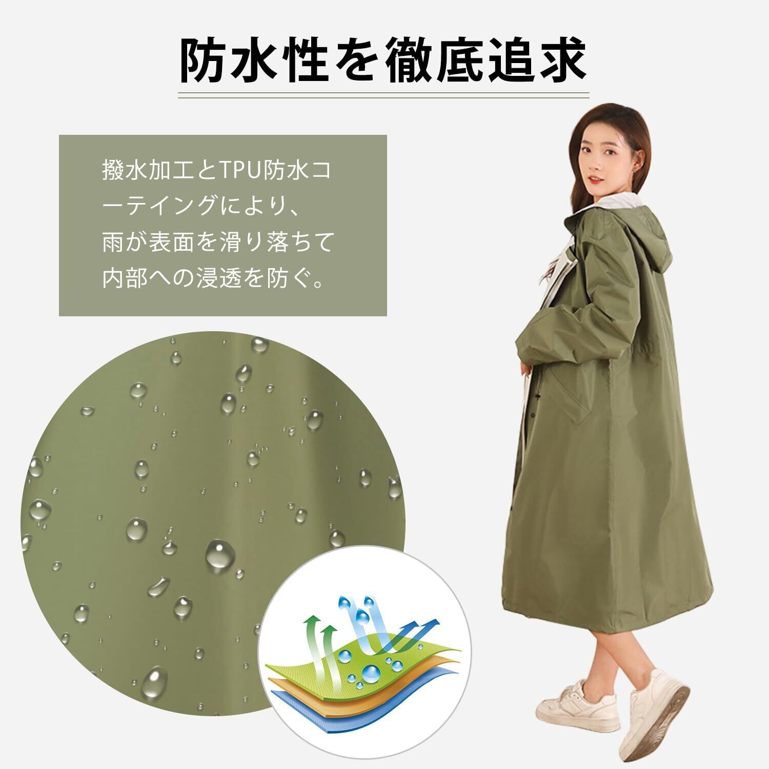 「このレインコートは、厳しい雨からあなたをしっかりと守る、超防水設計です。急な大雨でも安心の耐水性を誇りますので、アウトドアでの活動も気軽に楽しめます!」