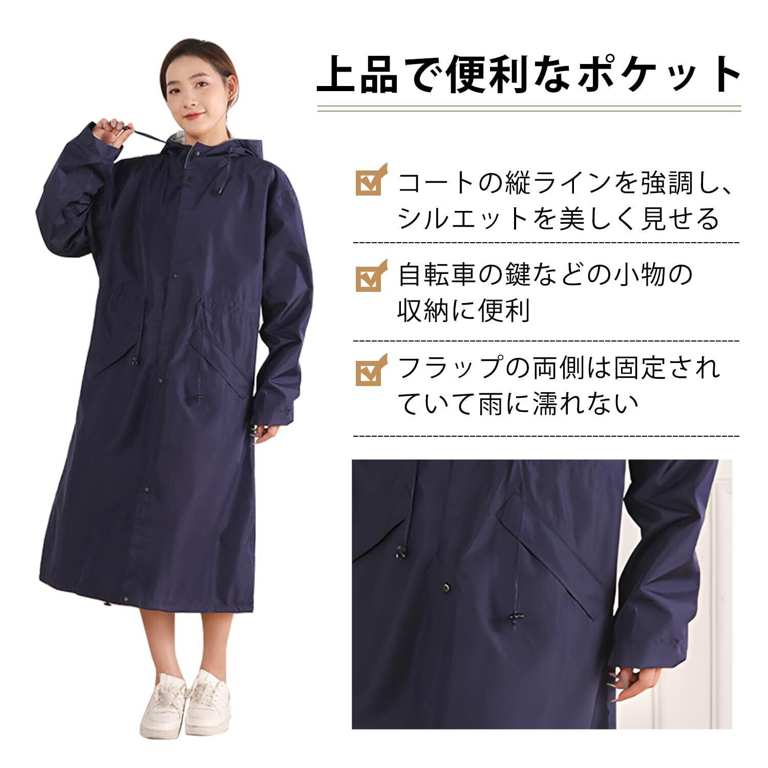 【上品で便利なポケット】コートの縦ラインを強調し、シルエットを美しく見せます。自転車の鍵などの小物収納にも便利です