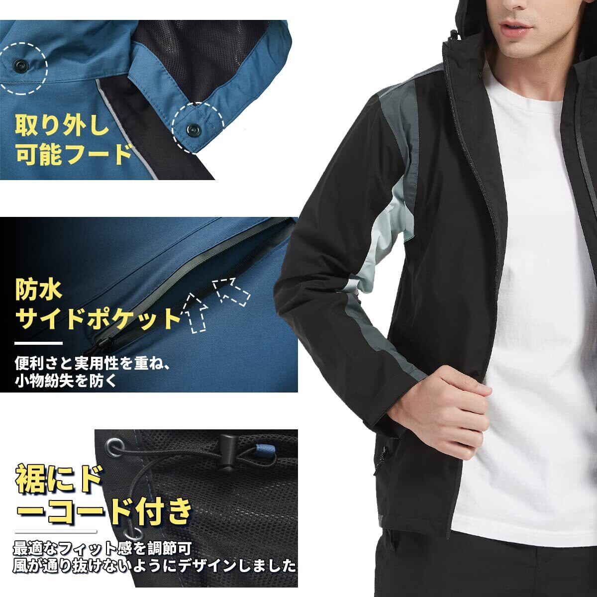【超防水・仕様】両面防水を備えたレインスーツ、縫い目に特殊な加工を施し、防水性を高め、豪雨であっても水の浸入を強力に防ぐ。フードは着脱でき、首元のドローコードでフィット感調整可能、ズボンは前開きです。マジック調節を二の腕と裾に備え&ズボン裾部分に面ファスナー、ボタンで幅が調整でき、防水性能をより理想的になります。