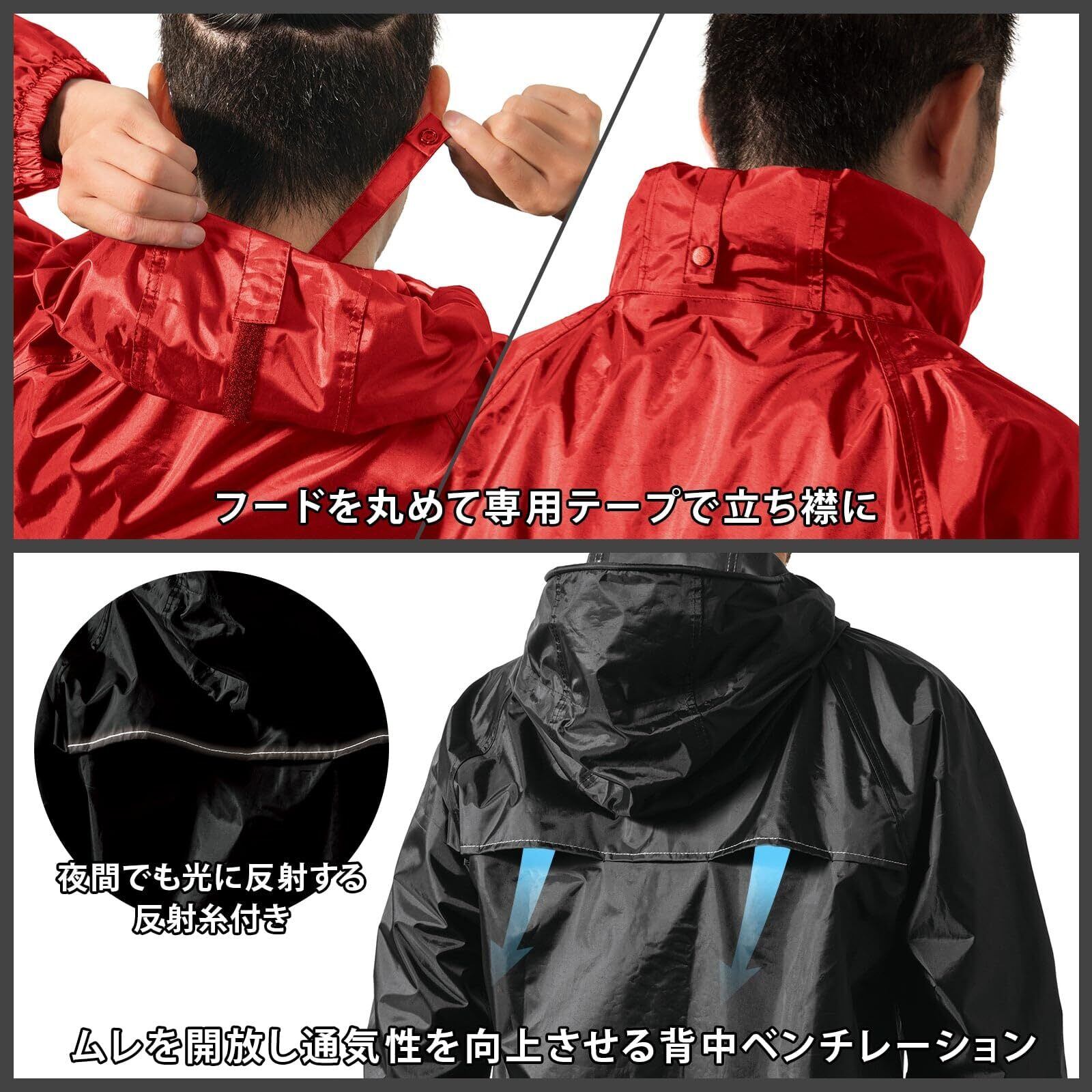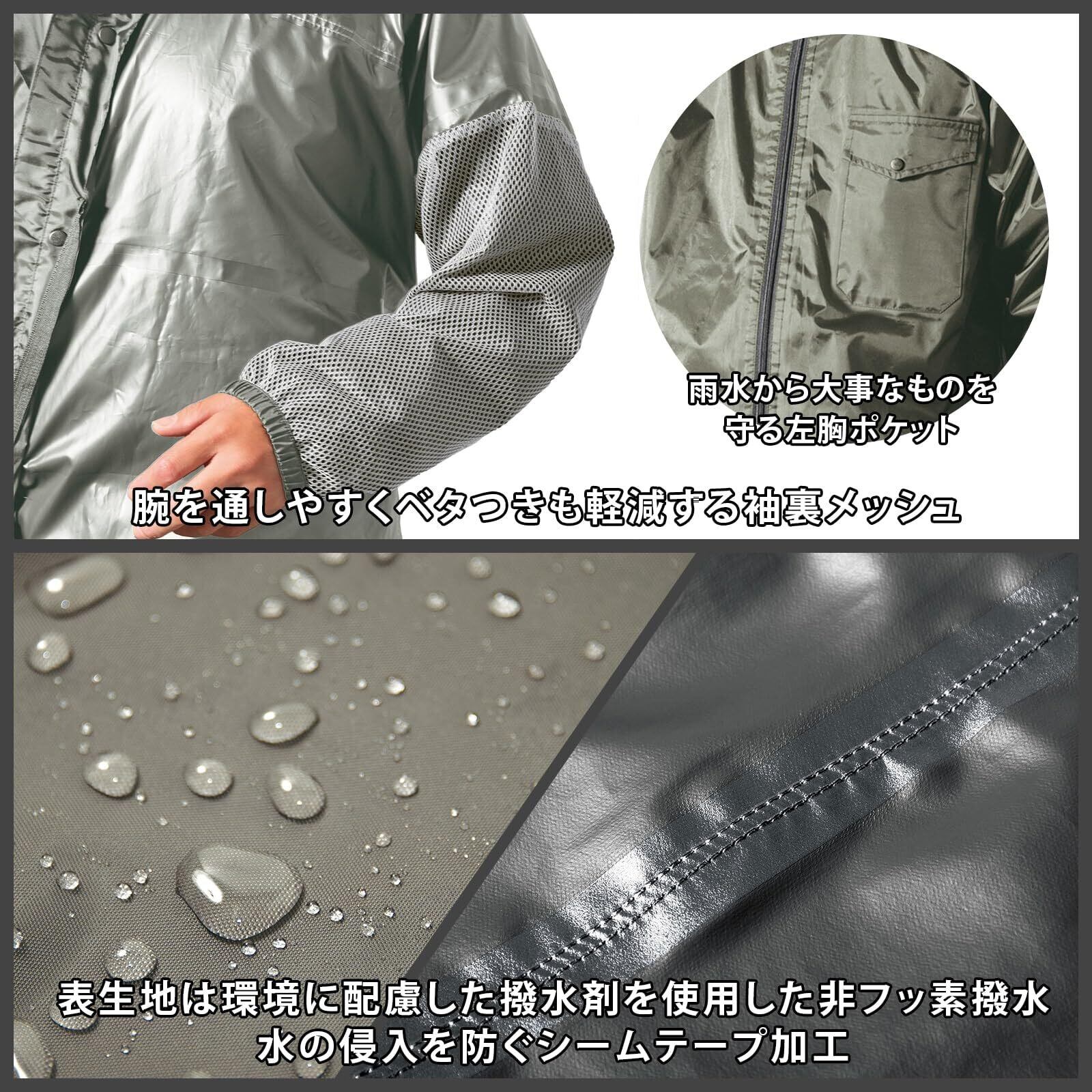 【特徴】驚くほど動きやすいレインスーツです。フード・足元の調整が簡単に行えます。フードの調節コードで頭と首元をぴったりフィット、サイズ調整テープで視界すっきり。フードを丸めて専用テープで立ち襟にもできます。さらにファスナーの内側には正面からの雨や水滴の侵入を防ぐシームテープ加工が施されており、スーツ内部への水滴の侵入を大幅にカットできます。ムレを開放し通気性を向上させる背中ベンチレーションや、腕を通しやすくベタつきも軽減する袖裏メッシュを採用。また、表生地は環境に配慮した撥水材を使用しています(非フッ素撥水)。通勤・通学・アウトドアなど様々な場面でマルチにお使いいただけます。